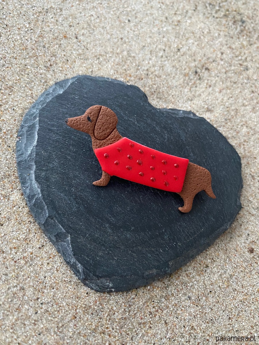 Broszka jamnik w czerwonym sweterku
