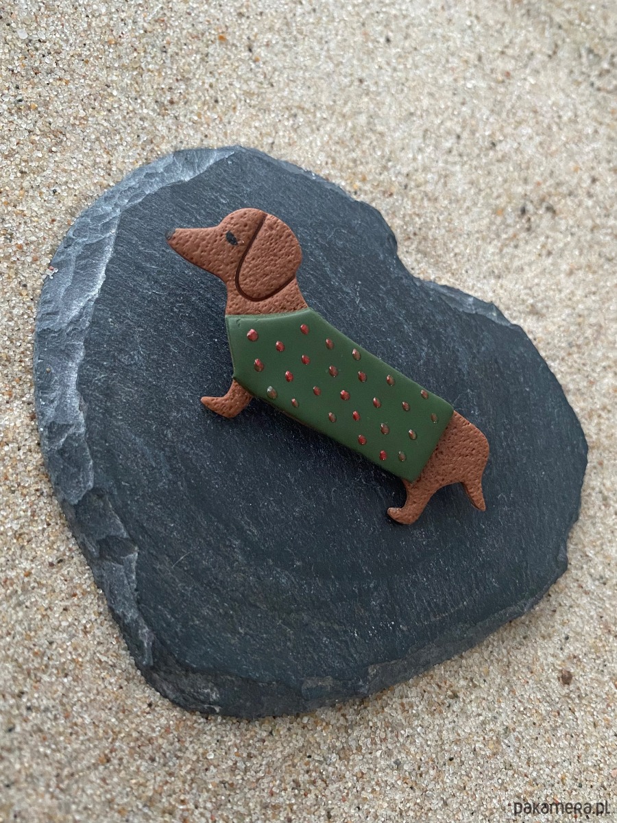 Ręcznie wykonana broszka jamnik w zielonym sweterku z drobnymi kropeczkami. Subtelna, a jednocześnie przyciągająca wzrok – idealna dla osób ceniących detale.