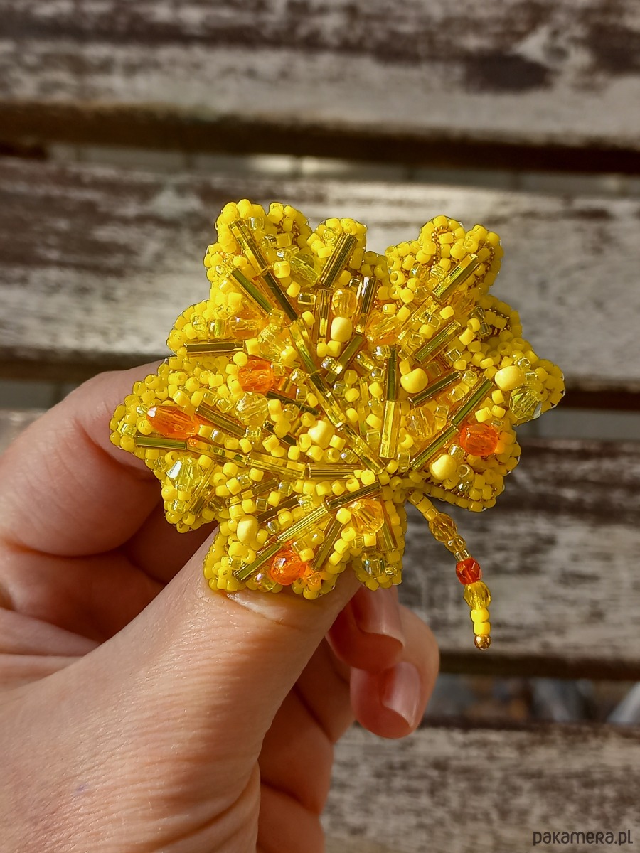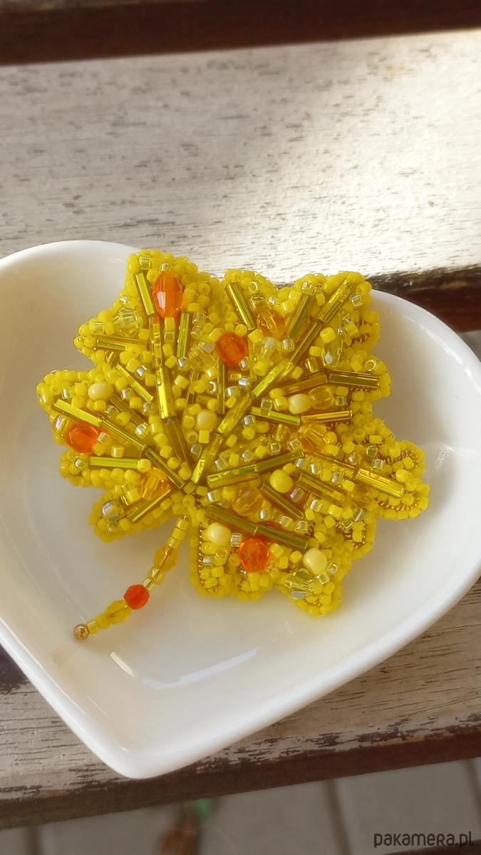 Niepowtarzalna, ręcznie szyta broszka, wykonana metodą haftu koralikowego. Każdy koralik wyszywany jest pojedynczo, dzięki czemu ozdoba jest unikatowa i wyjątkowa. Broszka ma wielkość około 6 cm długości z ogonkiem, szerokość około 5 cm, wykończenia stalowe w kolorze złotym, zapięcie typu agrafka. Od spodu podszyta jest ekoskórką z wzorem.