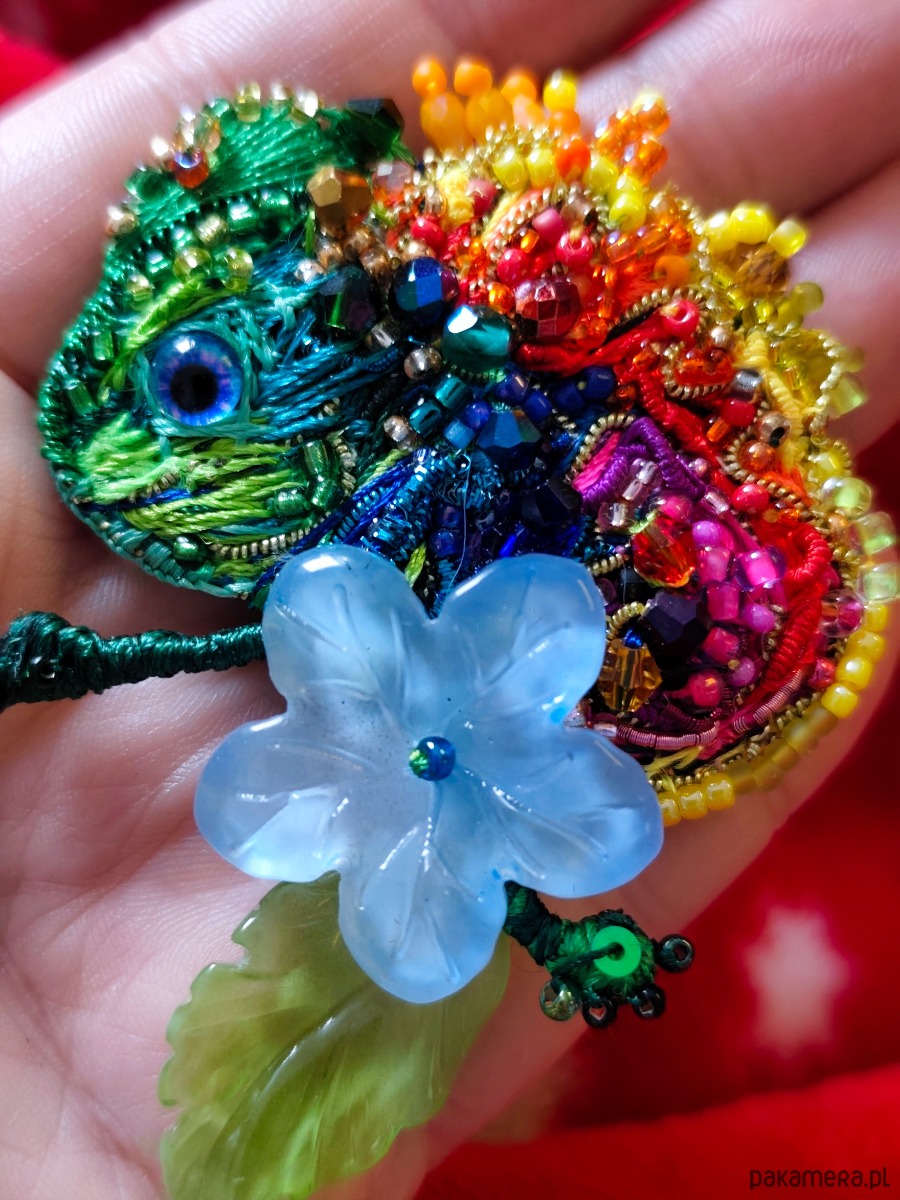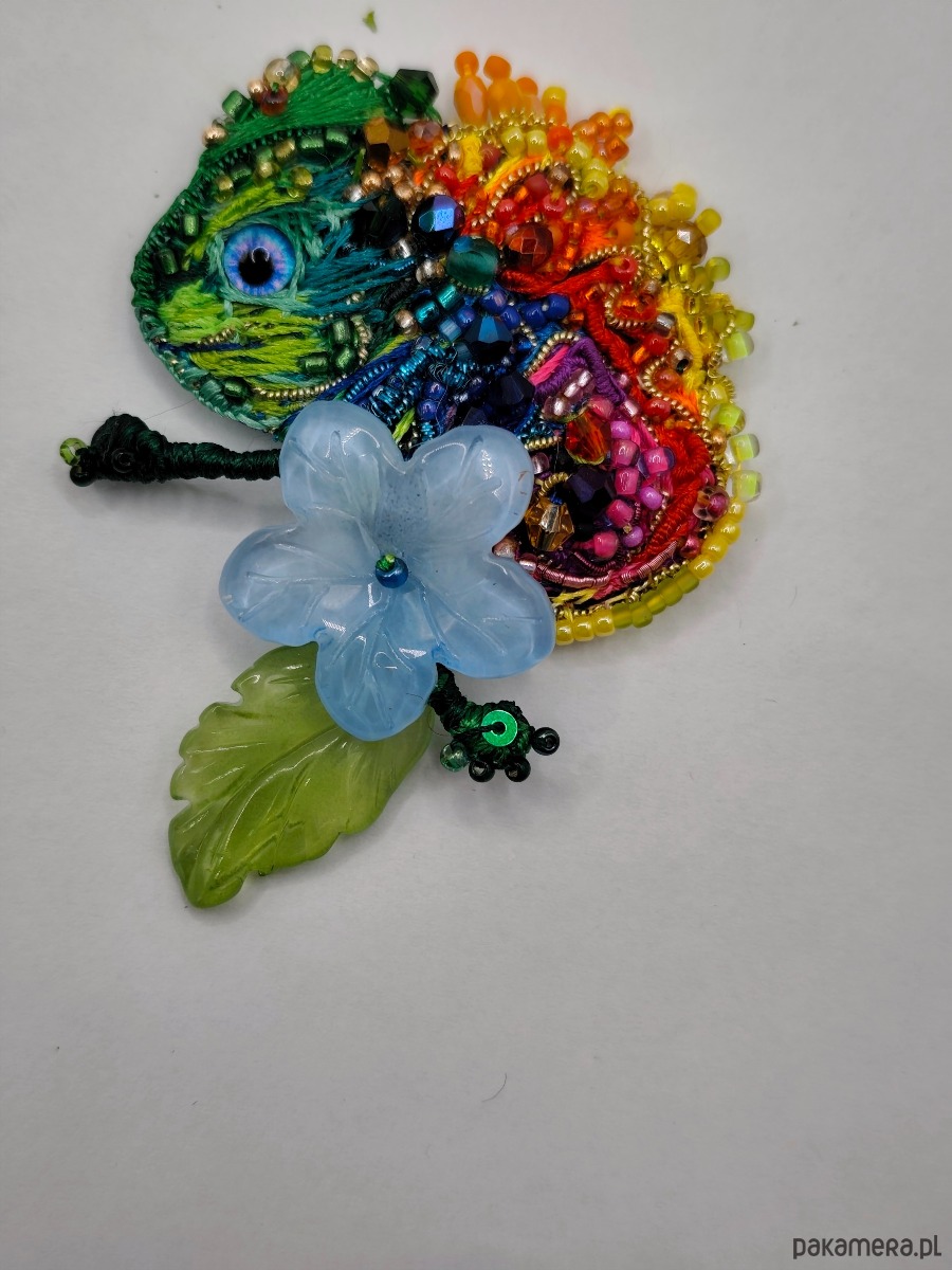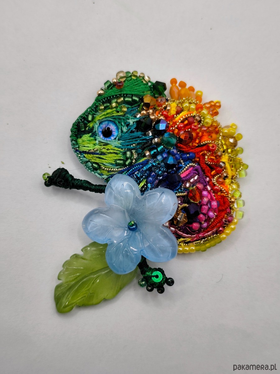Haftowana broszka kameleon, koraliki szklane zapięcie broszkowe z zabezpieczeniem 7 na 5 cm.