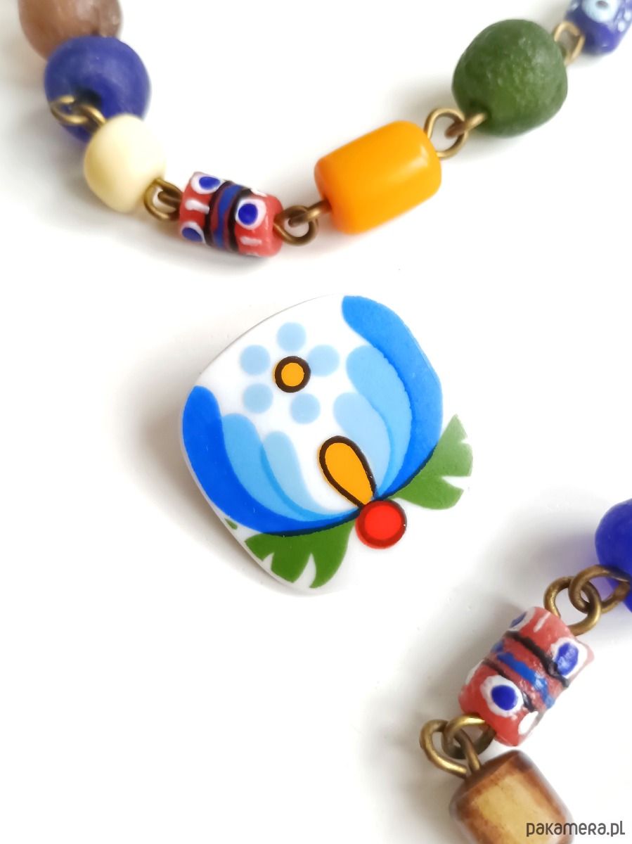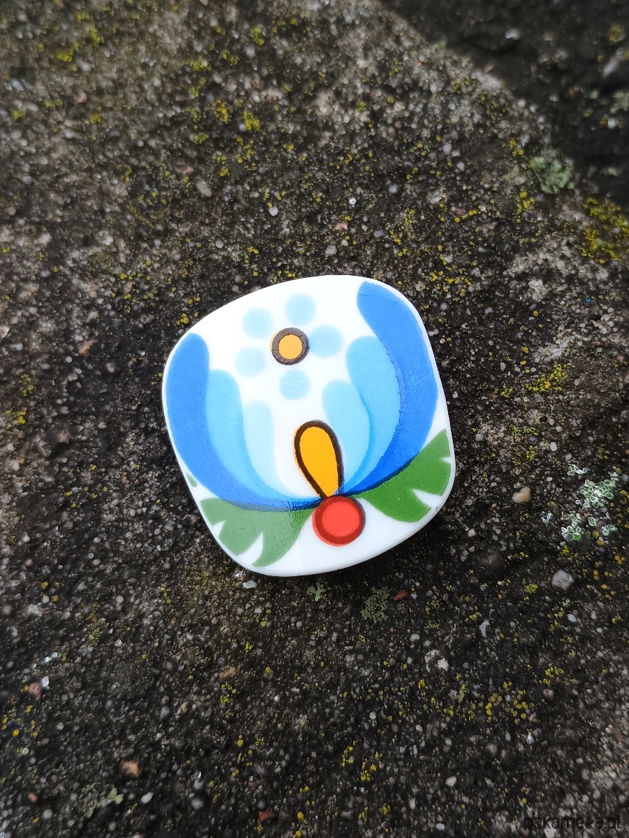 Broszka, którą wykonałam z fragmentu stłuczonego talerza wyprodukowanego w fabryce Lubiana z tradycyjnym wzorem kaszubskim. Kawałek stłuczki oszlifowałam i połączyłam z metalowym zapięciem. Ceramikę zeszlifowałam również z grubości - jest cieńsza niż pierwotnie, dzięki czemu przypinka nie jest ciężka. Brzegi i tył pokryłam lakierem, co sprawia, że nie brudzą się i nie chłoną wilgoci. Wymiary elementu ceramicznego: 30 x 30 mm. Unikat - każdy z moich wyrobów występuje w jednym egzemplarzu. Upcykling - nie reprodukuję wykorzystywanych wzorów, niczego nie domalowuję - wykorzystuję wyłącznie oryginalne naczynia i motywy, które się na nich znajdują. Tym samym, stłuczce z odzysku nadaję nowe życie.