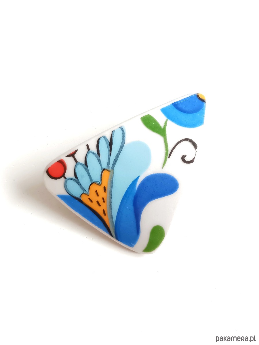Trójkątna broszka, którą wykonałam z fragmentu stłuczonej miseczki wyprodukowanej w fabryce Lubiana z tradycyjnym wzorem kaszubskim. Kawałek stłuczki oszlifowałam i połączyłam z metalowym zapięciem. Ceramikę zeszlifowałam również z grubości - jest cieńsza niż pierwotnie, dzięki czemu przypinka nie jest ciężka. Brzegi i tył pokryłam lakierem, co sprawia, że nie brudzą się i nie chłoną wilgoci. Wymiary elementu ceramicznego: 28 x 40 mm. Unikat - każdy z moich wyrobów występuje w jednym egzemplarzu. Upcykling - nie reprodukuję wykorzystywanych wzorów, niczego nie domalowuję - wykorzystuję wyłącznie oryginalne naczynia i motywy, które się na nich znajdują. Tym samym, stłuczce z odzysku nadaję nowe życie.
