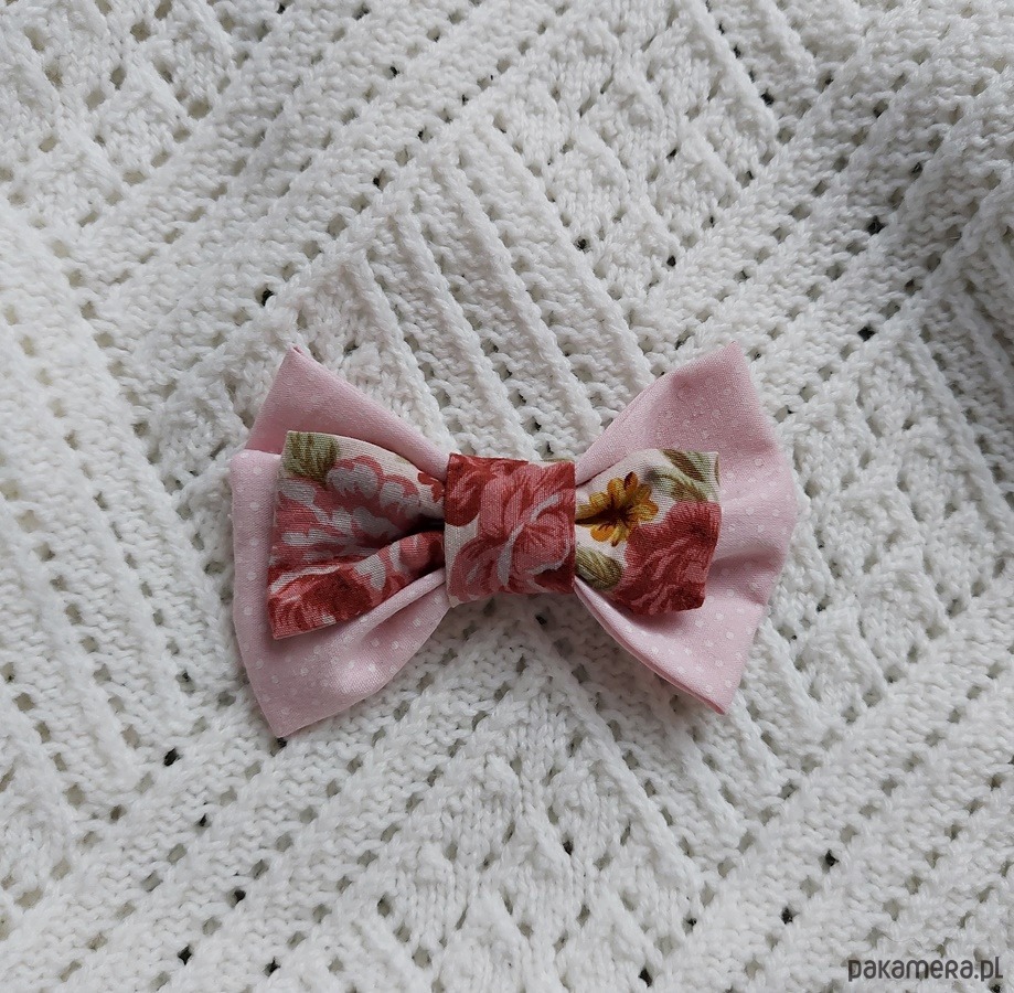 Ręcznie formowana kokardka z tkanin w kropki i kwiatki. Piękna broszka nie tylko dla romantyczek, ale osób lubiących jednokolorowe części garderoby, którym przyda się wzorzysty akcent.