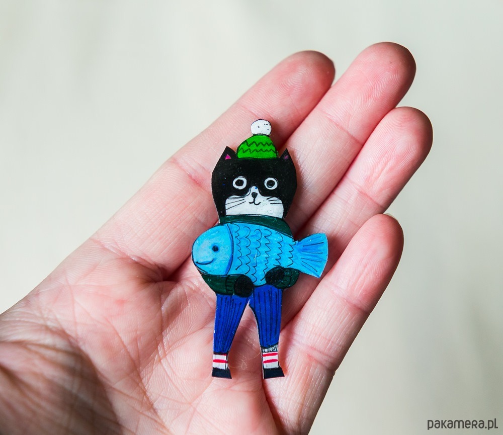 Cały ten spektakl rybno-koci zapakowany jest w elegancki tekturowy kartonik, który chroni zarówno broszkę, jak i godność karpia (na ile to jeszcze możliwe). Idealny prezent dla miłośników kotów, humoru i lekkiego chaosu świątecznego.