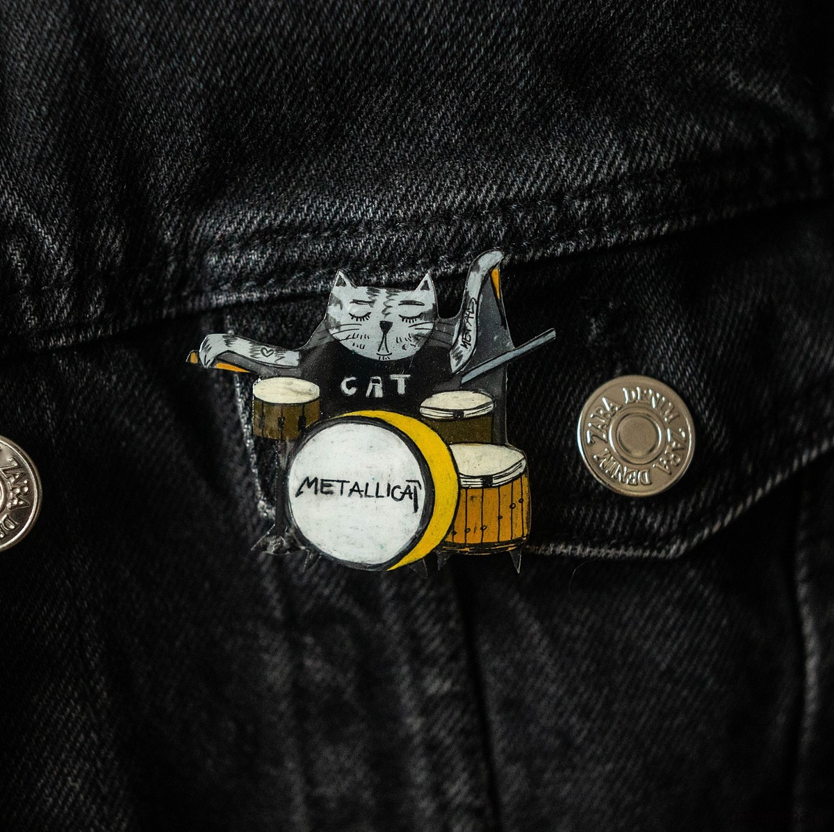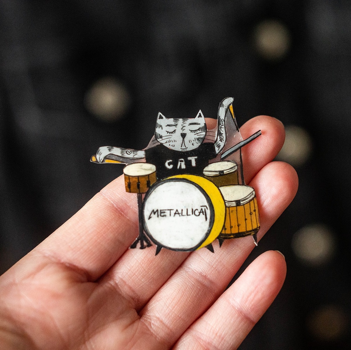Zabawna , średniej wielkości broszka z kotem perkusistą, ręcznie rysowana kredkami i zabezpieczona lakierem ekologicznym.