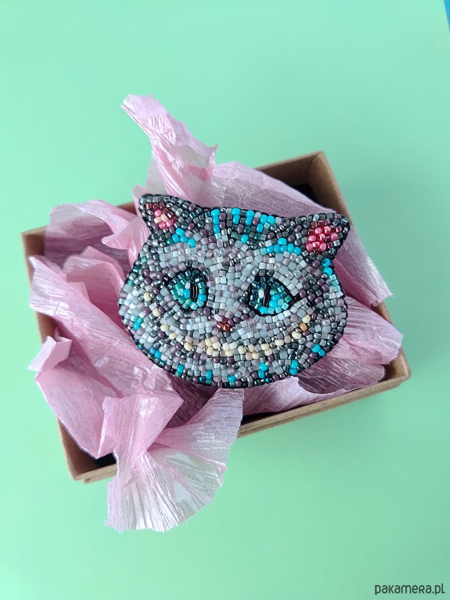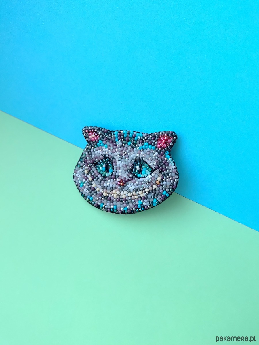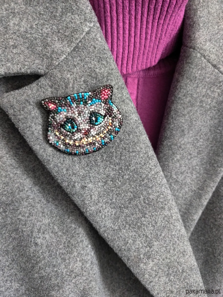 Broszka Kot z Cheshire, ręczny haft koralikami
