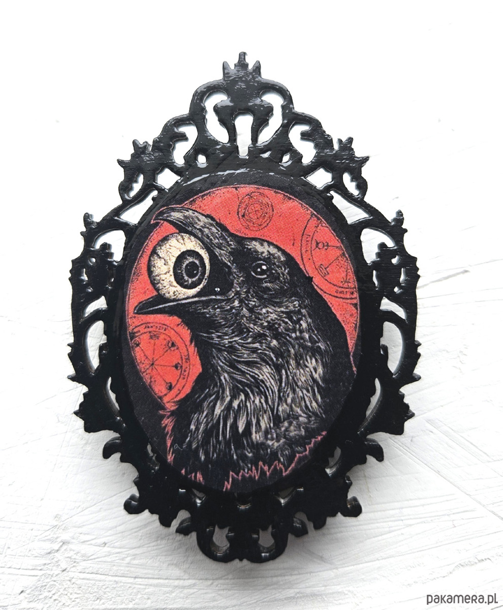 drewniana broszka, ozdobiona techniką decoupage, wykończona farbami akrylowymi i zabezpieczona wielokrotnie lakierem, długość 6,5 cm, szerokość: 4,5 cm