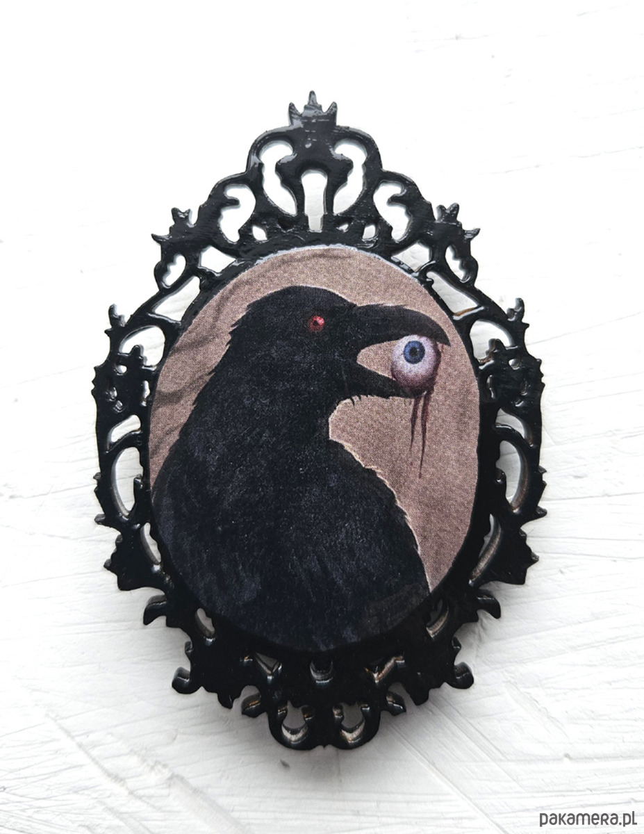 drewniana broszka, ozdobiona techniką decoupage, wykończona farbami akrylowymi i zabezpieczona wielokrotnie lakierem, długość 6,5 cm, szerokość: 4,5 cm