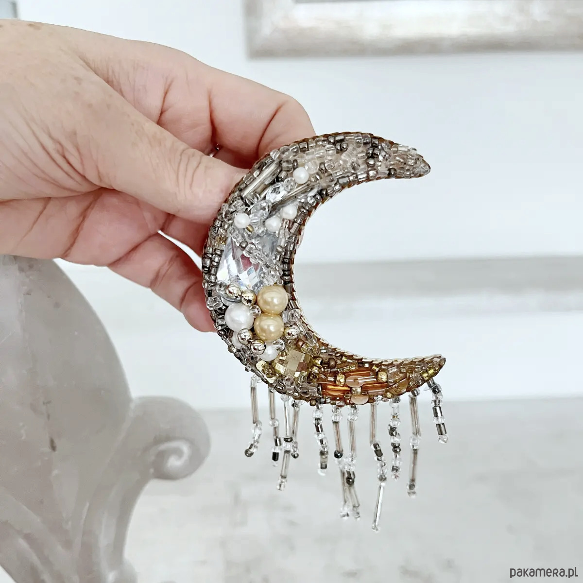 Broszka KSIĘŻYC 3 ręcznie haftowana koraliki