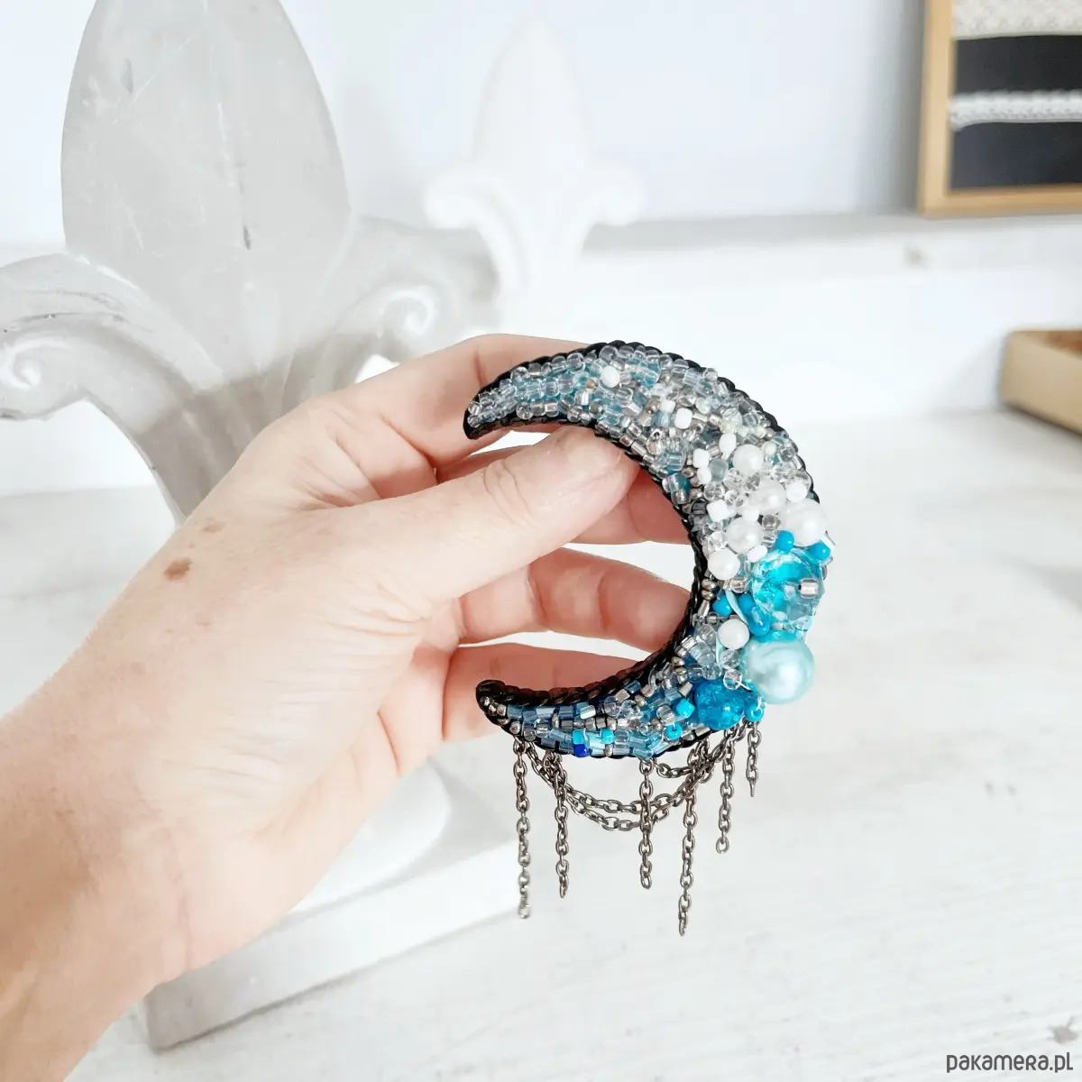Ręcznie haftowana broszka KSIĘŻYC powstała z myślą o kobietach, które potrafią dostrzegać piękno w prostych chwilach i mają w sobie wewnętrzny blask.