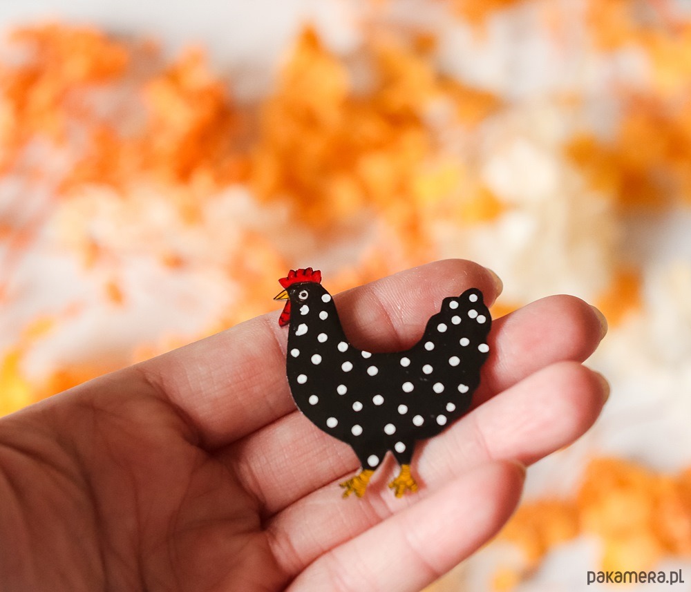 „Broszka z czarną kurką Rysią w białe kropki – małą, ale wyjątkowo charakterystyczną damą podwórka. Rysia dumnie prezentuje swoje eleganckie grochy, jakby właśnie wracała z pokazu mody w kurniku. Zdecydowanie zna swoją wartość i nie zawaha się jej zaprezentować na Twojej kurtce czy torbie. Broszka zapakowana w tekturowy kartonik, gotowa, by rozkikać każdy dzień odrobiną humoru i uroku.”