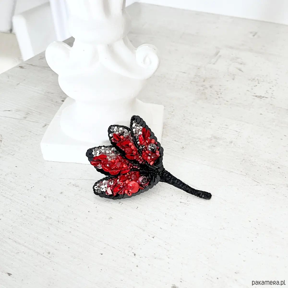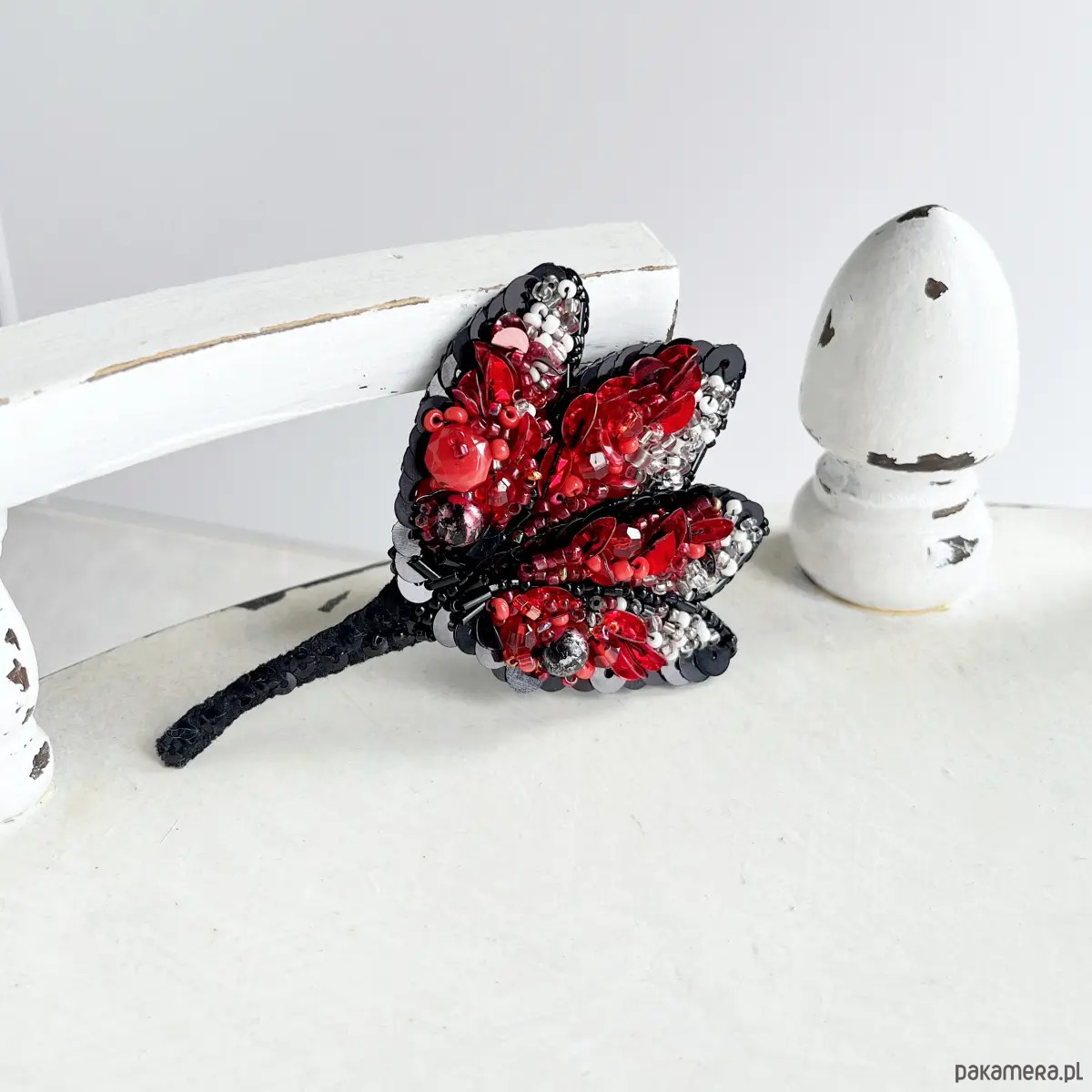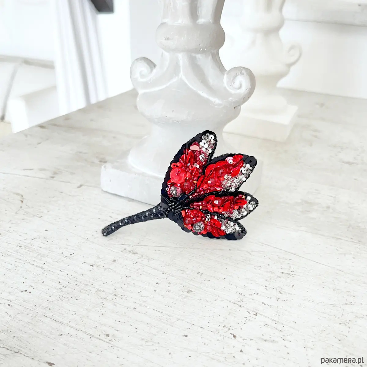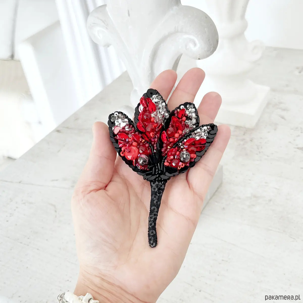 Płatki w odcieniach kremu, pudrowego różu i głębokiej czerwieni zostały ozdobione szklanymi koralikami oraz haftem.