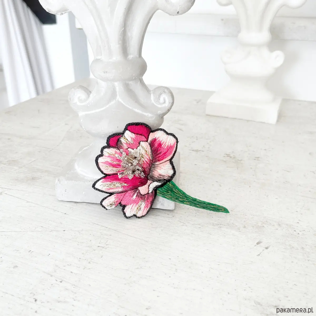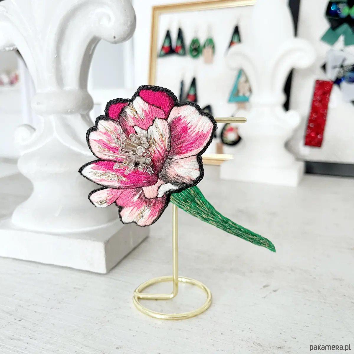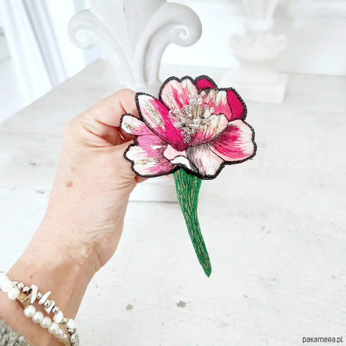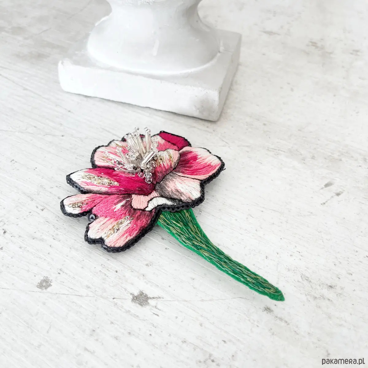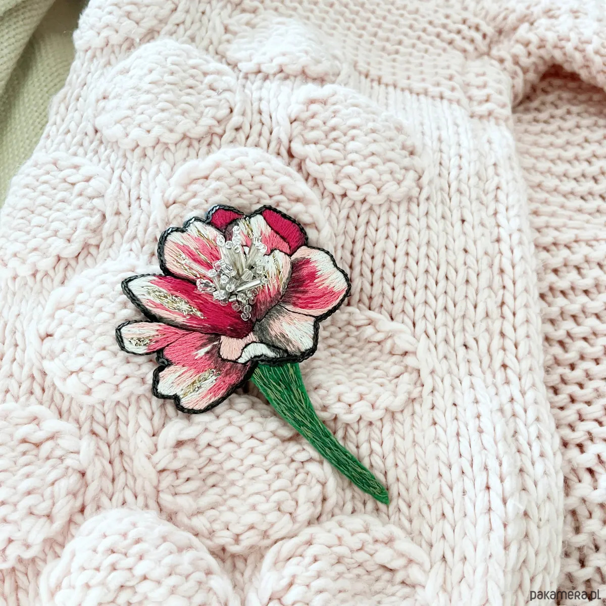 Broszka KWIAT 24 ręcznie haftowana przypinka z koralikami piwonia