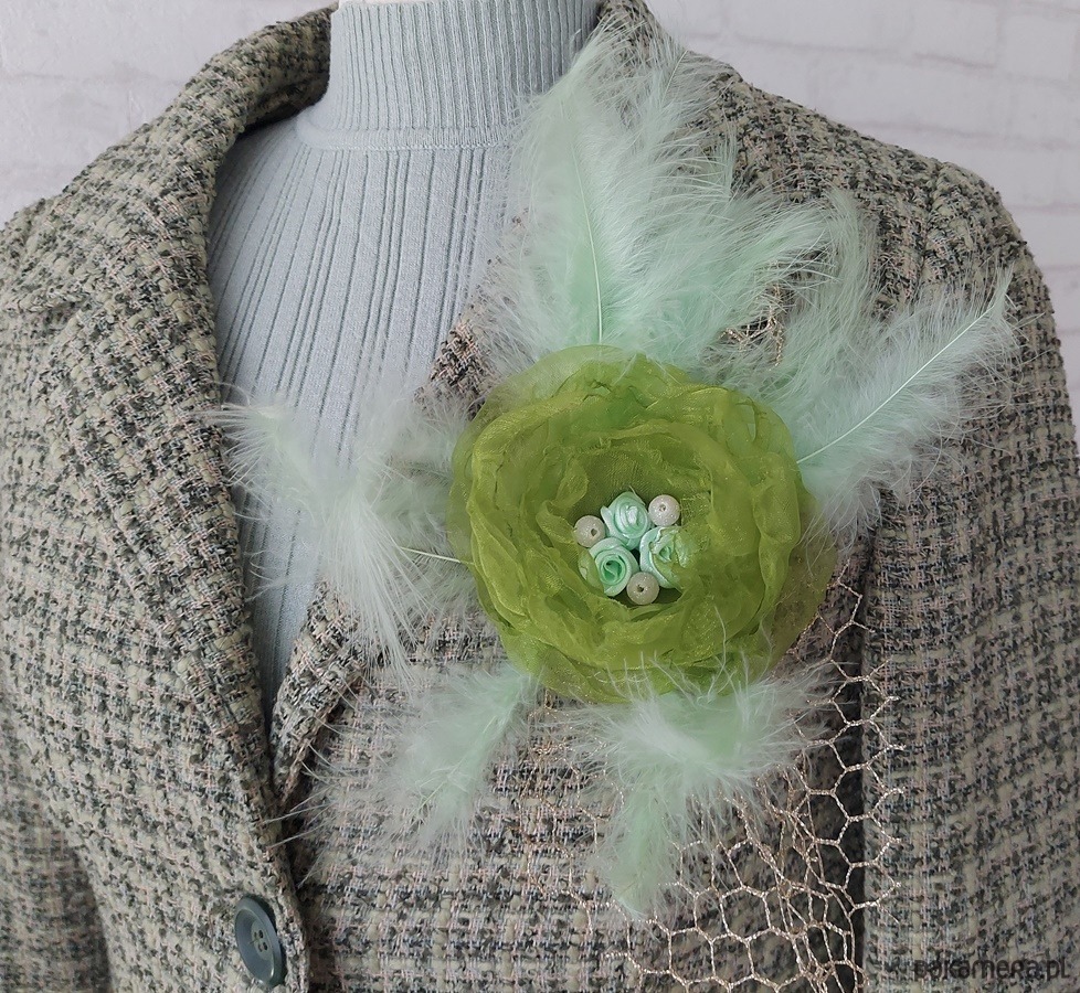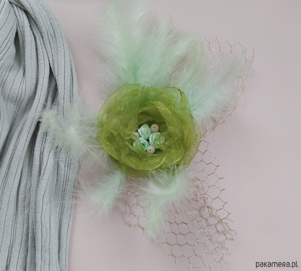 Ręcznie formowany kwiat wygląda tak, jakby powstał z mgły – jego płatki są półprzezroczyste, jest zatopiony w puszystych piórkach, zdaje się drżeć przy każdym ruchu. To unikalne i niezwykłe akcesorium.