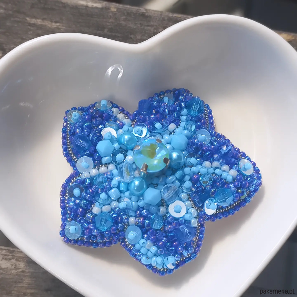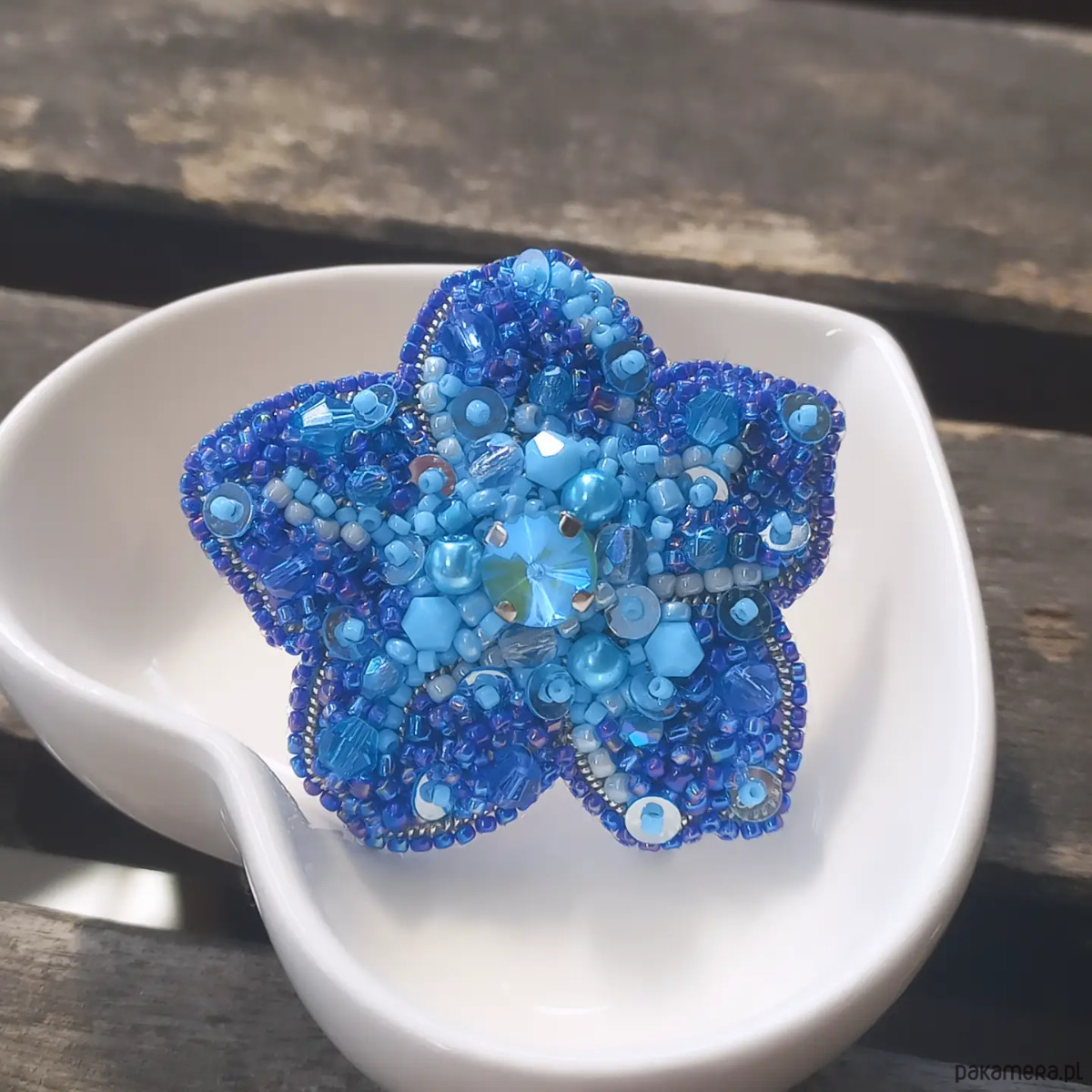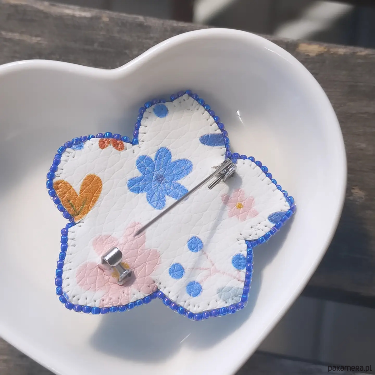 Niepowtarzalna, ręcznie szyta broszka, wykonana metodą haftu koralikowego. Każdy koralik wyszywany jest pojedynczo, dzięki czemu ozdoba jest unikatowa i wyjątkowa. Broszka ma wielkość około 4,5 cm długości i około 4,5 cm szerokości, wykończenia stalowe w kolorze srebrnym, zapięcie typu agrafka. Od spodu podszyta jest ekoskórką z wzorem.