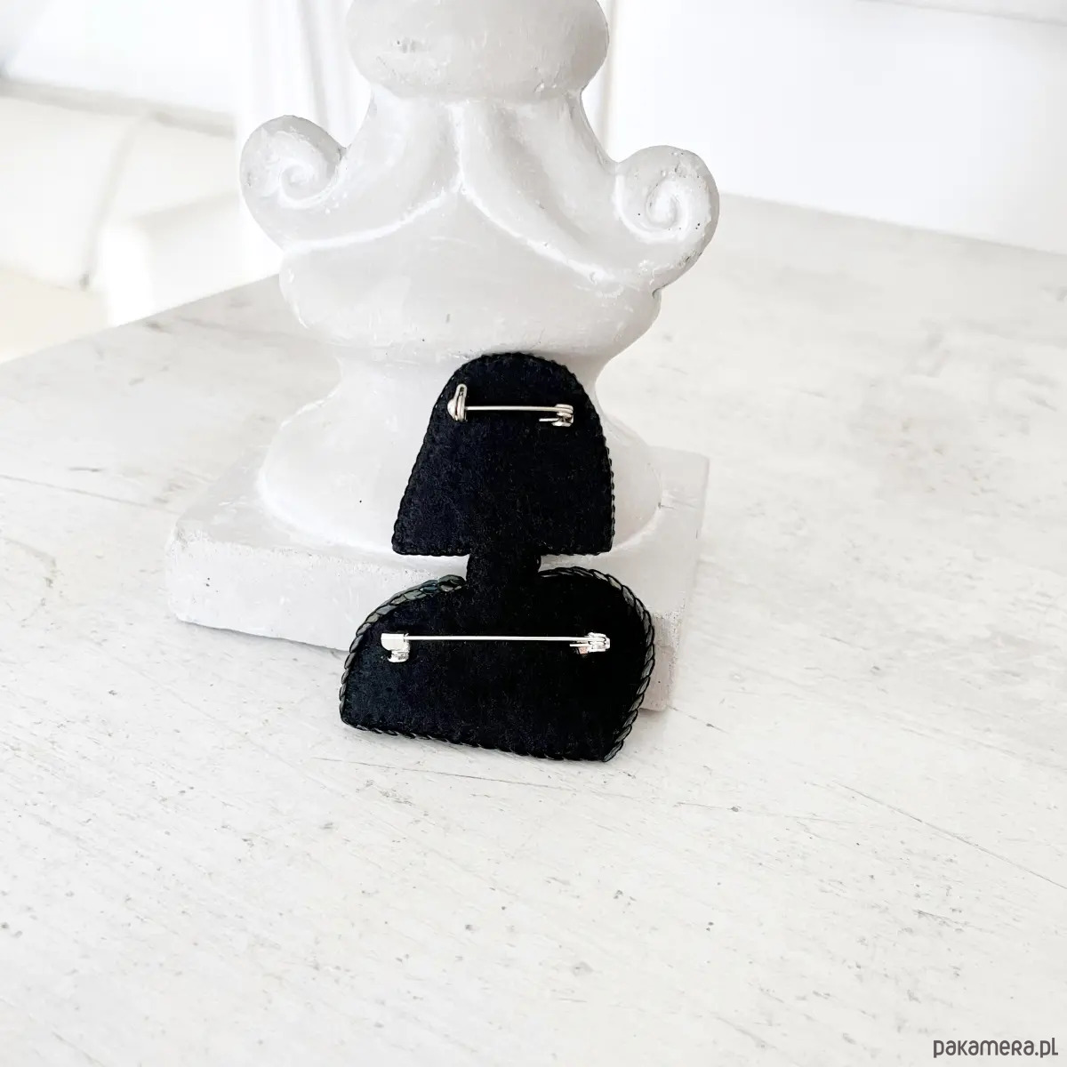 Wymiary broszki 5 x 7 cm. Z tyłu znajdują się dwa zapięcia.