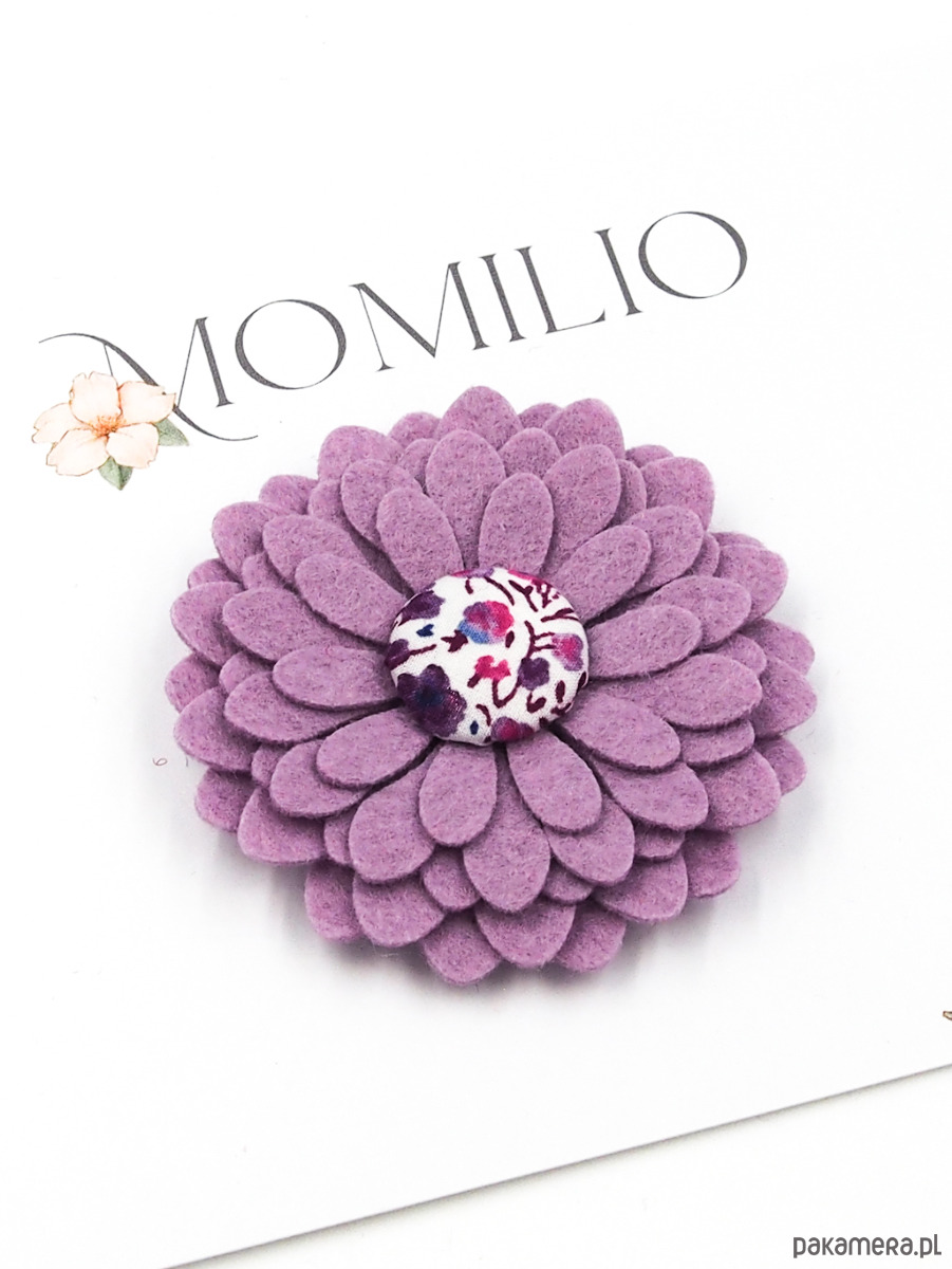 Ta urocza broszka jest wykonana z wełnianego filcu i ozdobiona kolorowym guziczkiem.
