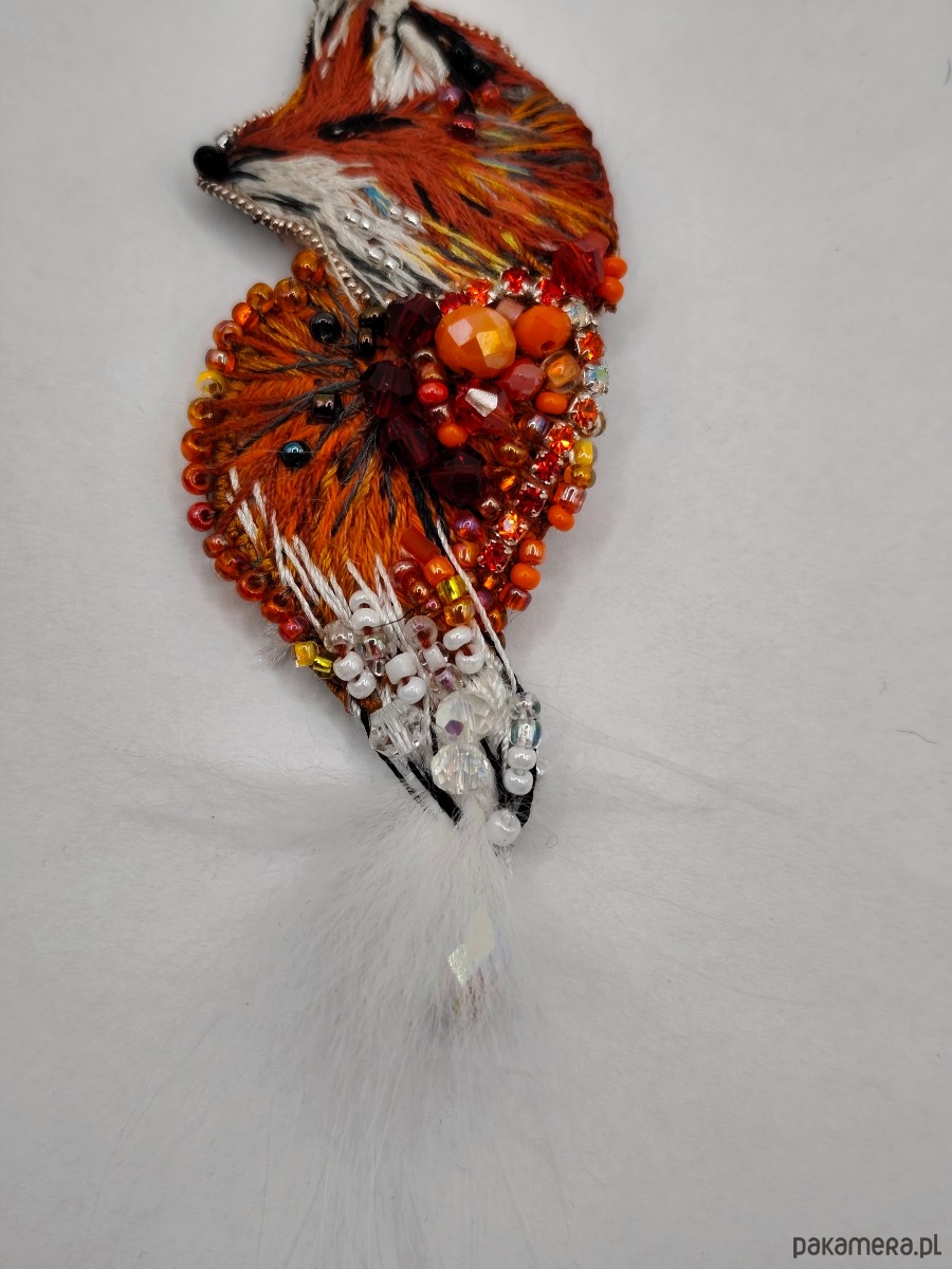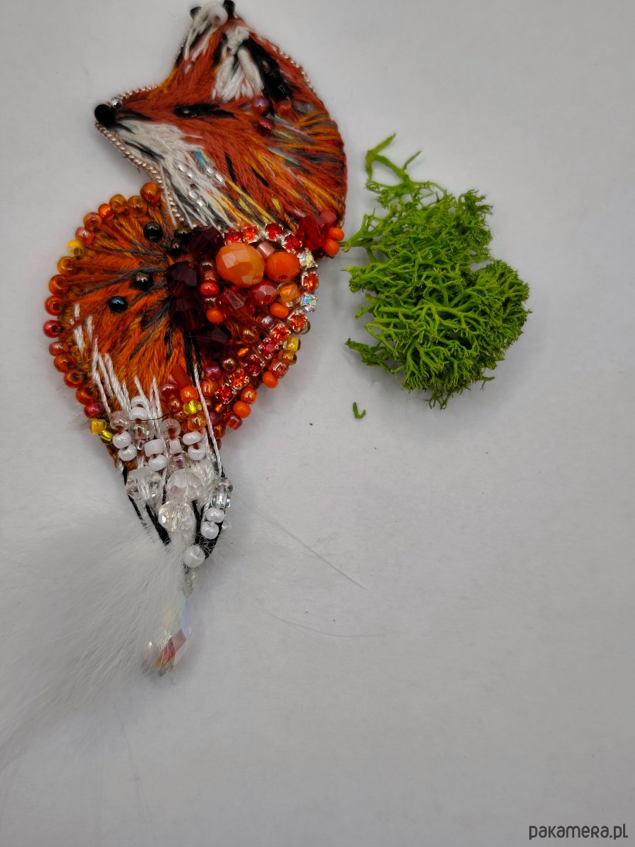 Wyjątkowa broszka przedstawiająca lisa – symbol sprytu, niezależności i naturalnego piękna. Każdy egzemplarz tworzony jest ręcznie z dbałością o detale, przy użyciu haftu oraz starannie dobranych koralików, które nadają całości subtelny blask i głębię.