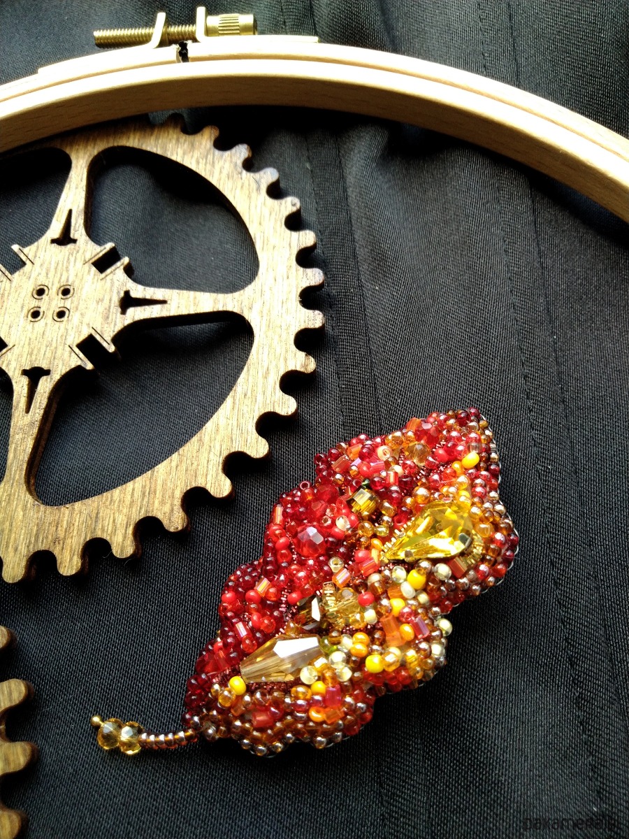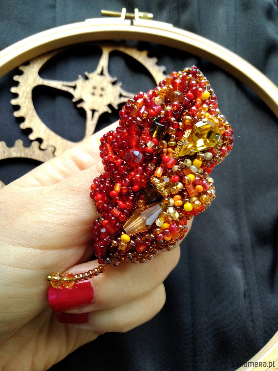 -Broszka haftowana koralikami czeskimi różnych rozmiarów i kształtów, szklanych kamieni na metalowej bazie, truncalu (drucik) indyjskiego dekoracyjnego.