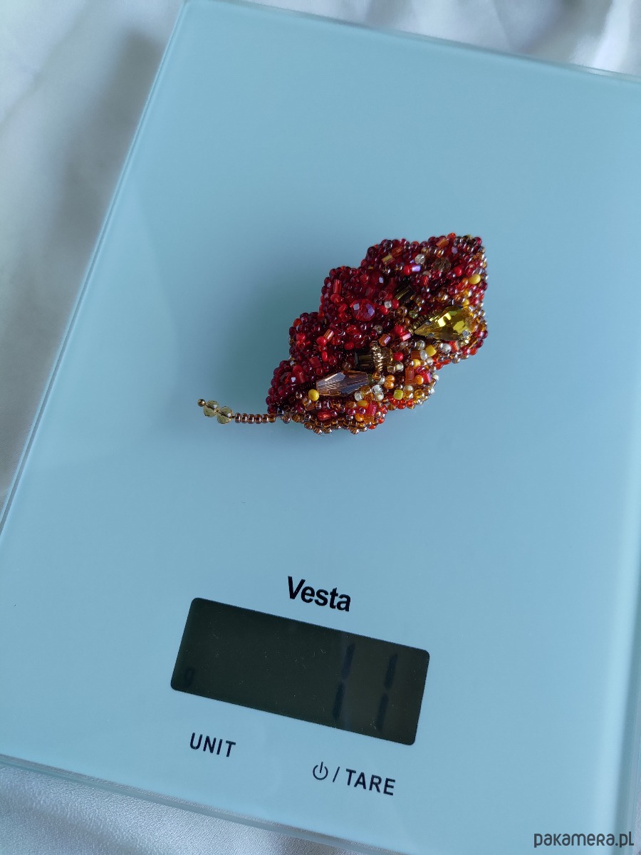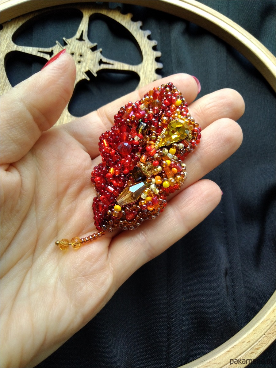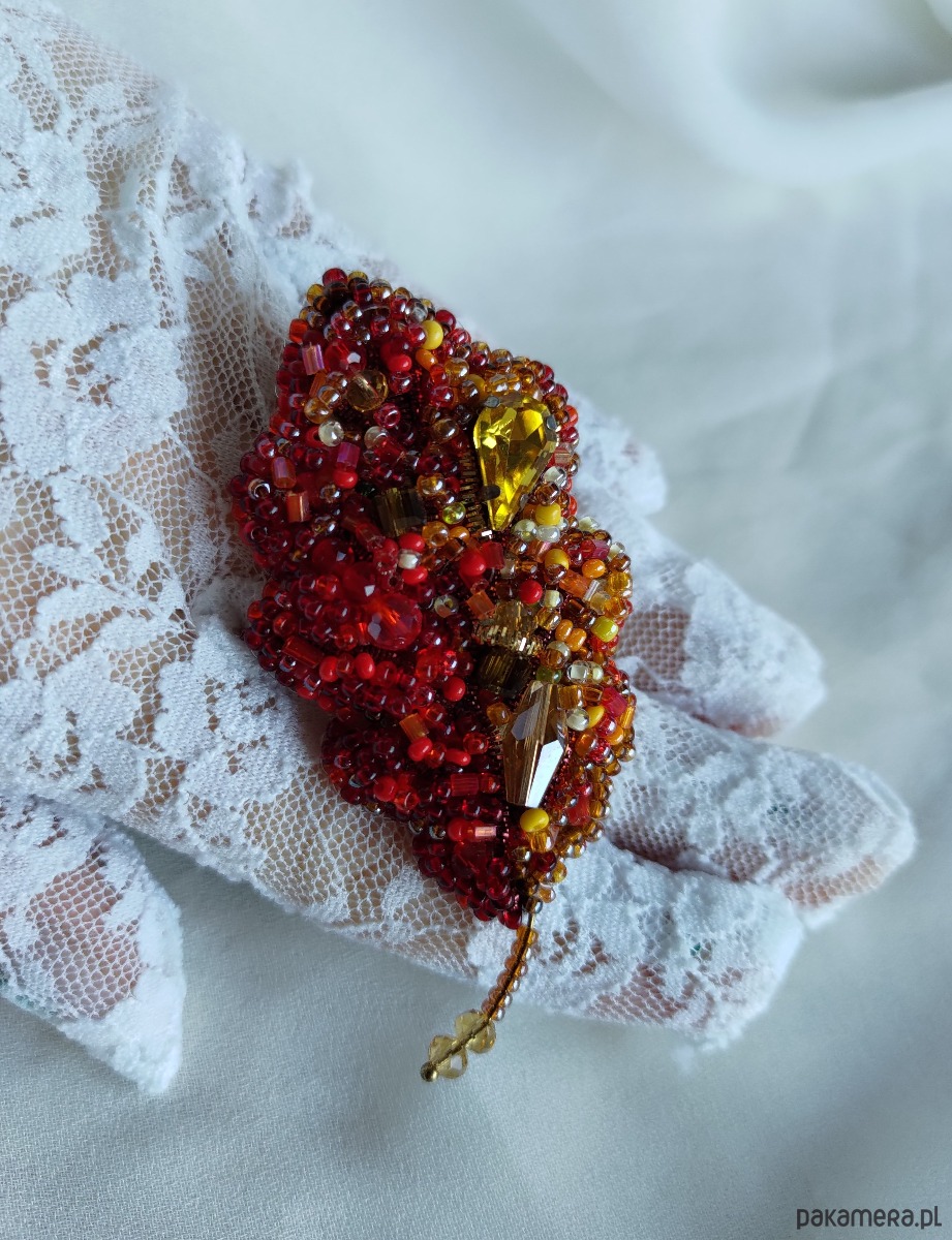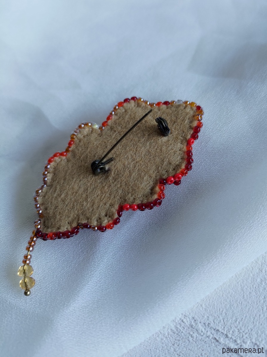 Przedstawiam broszka ręcznie haftowana w postaci liścia dębu.