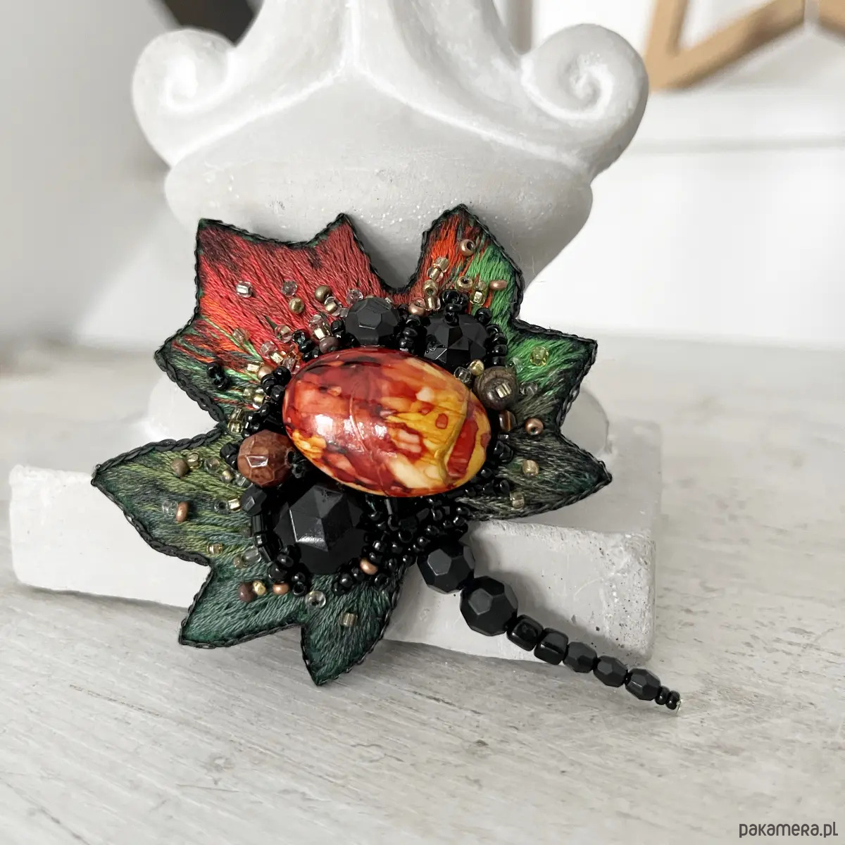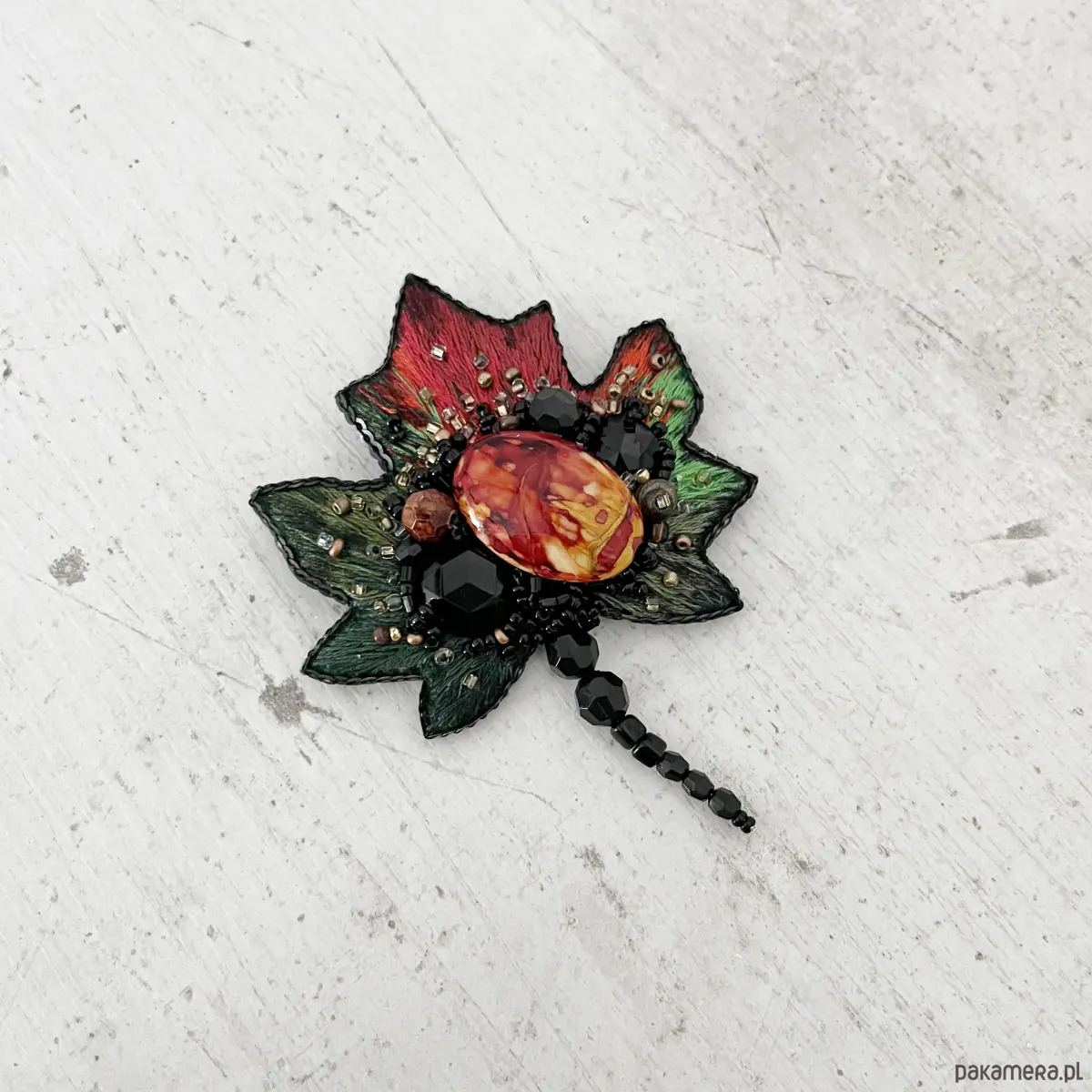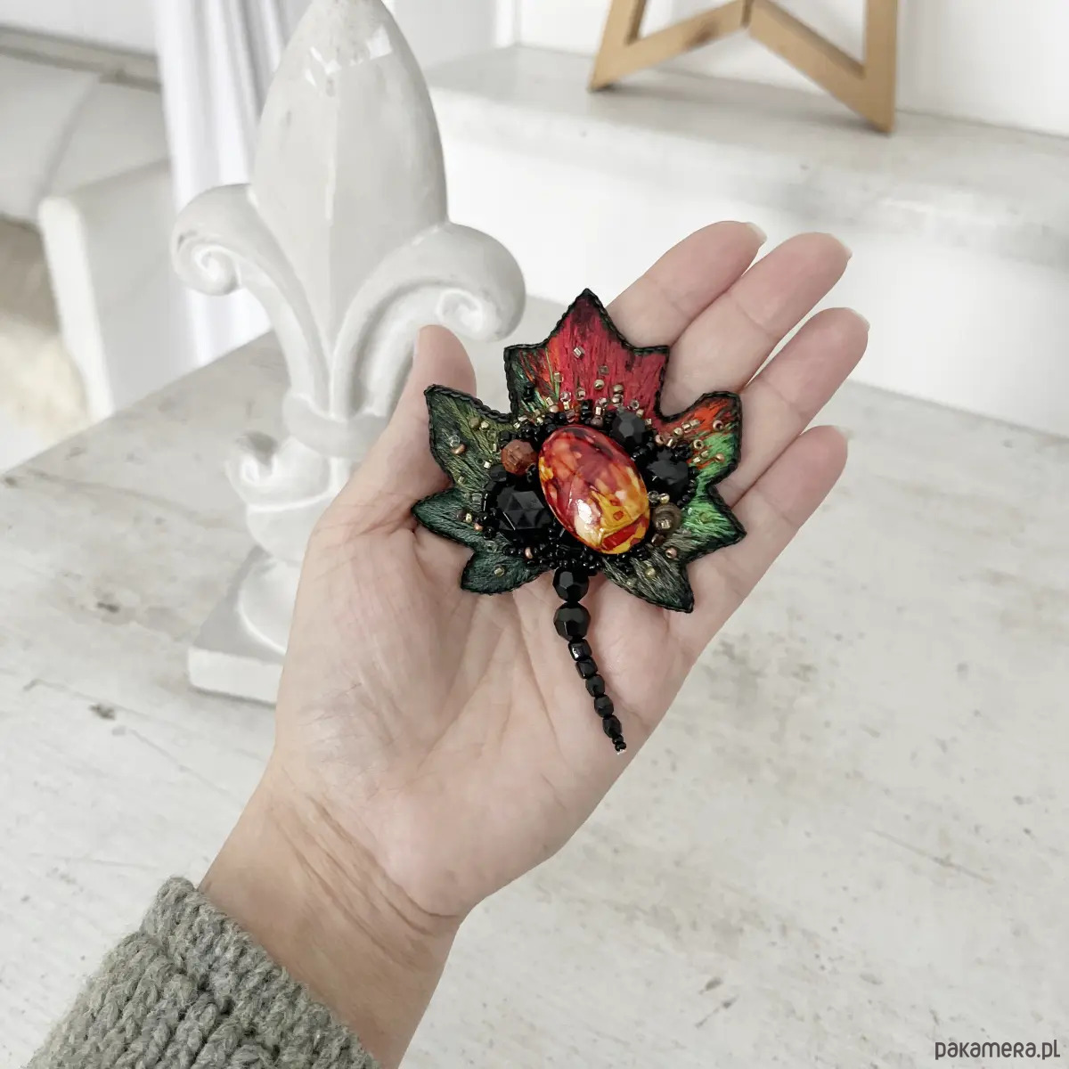 Niepowtarzalna, ręcznie haftowana broszka z koralikami z serii LIŚCIE KLONU.