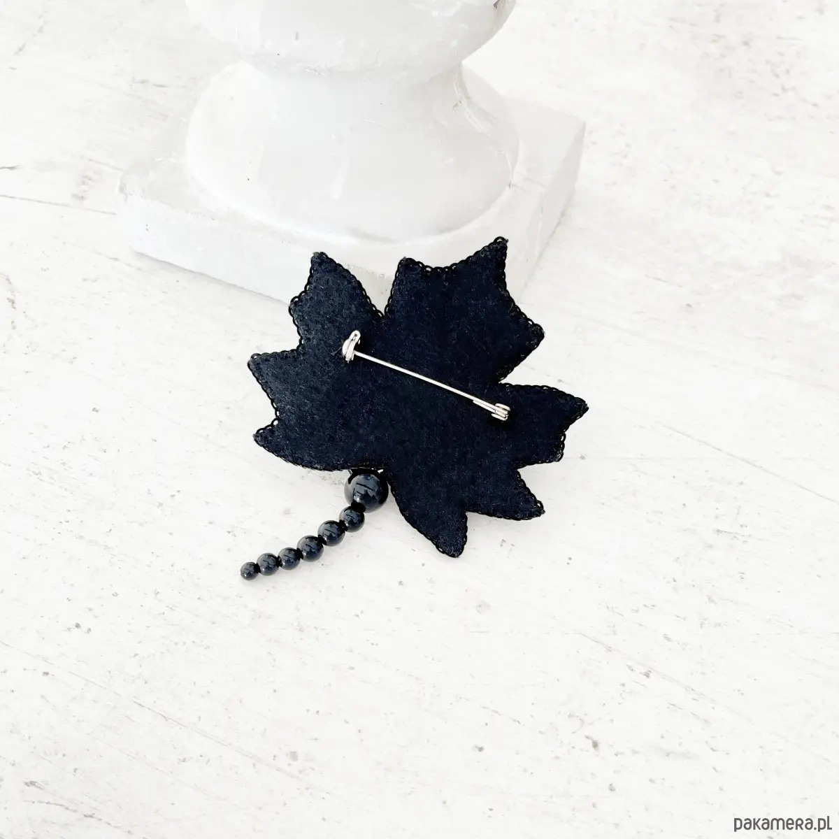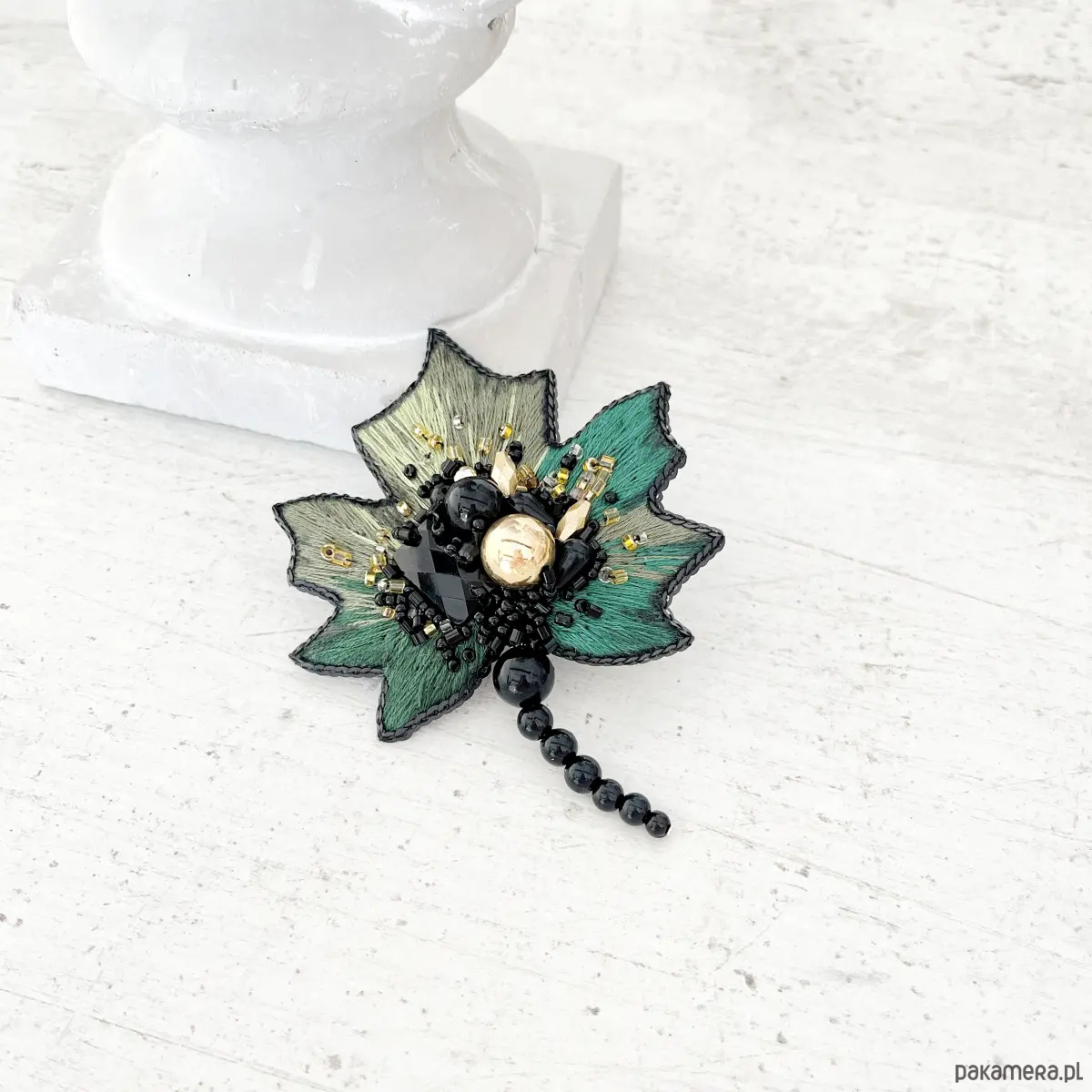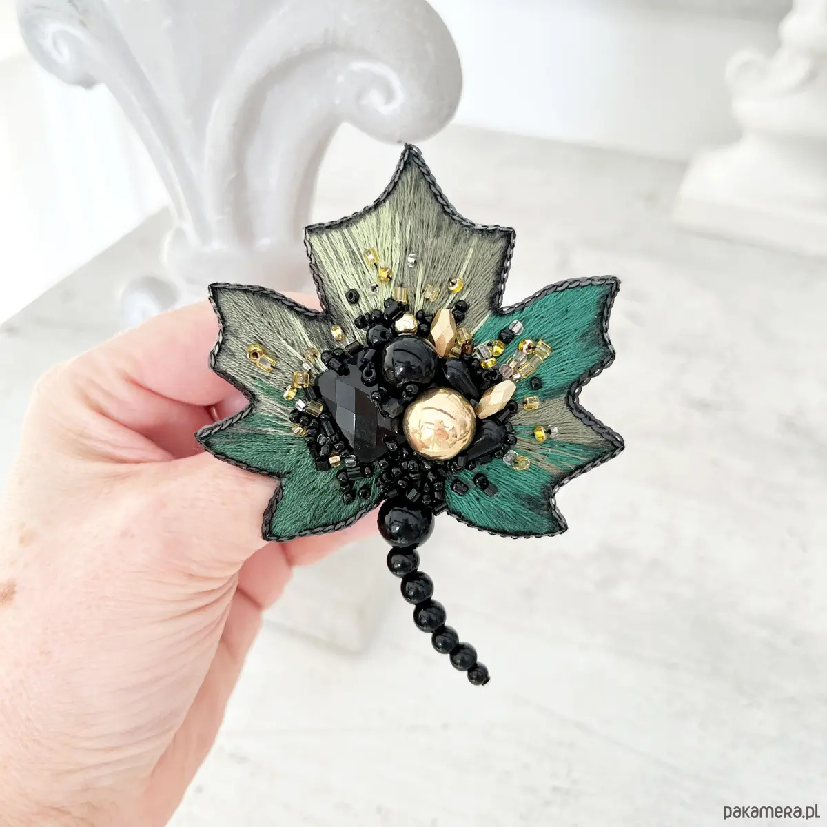Niepowtarzalna, ręcznie haftowana broszka z koralikami z serii LIŚCIE KLONU.