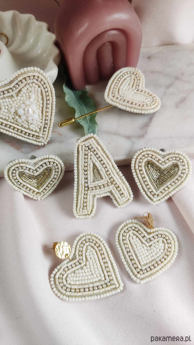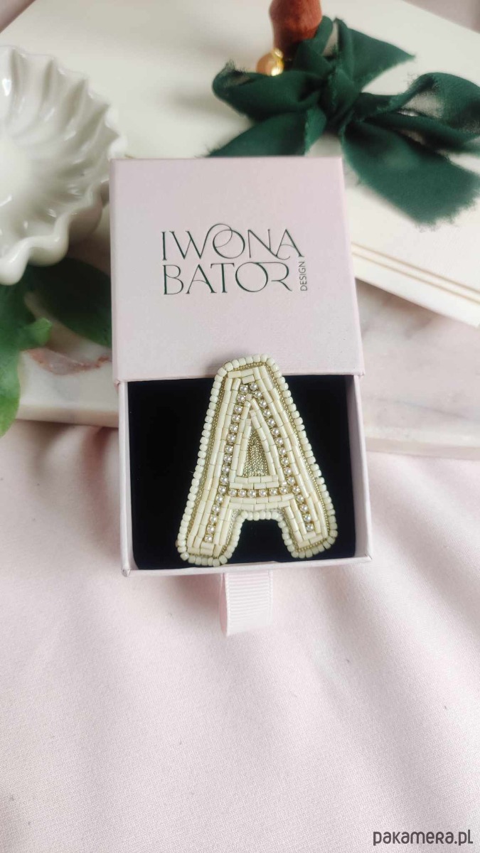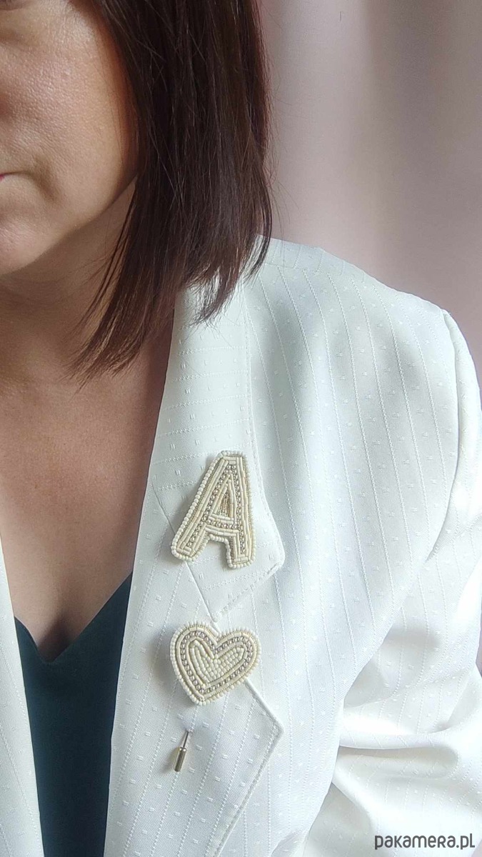 Całość broszki jest ręcznie wyszyta drobnymi szklanymi koralikami wysokiej jakości oraz kryształkami w formie taśmy cyrkoniowej. Tył broszki został podszyty skórą z upcycklingu za pomocą koralików i mocnej nitki, co zapewnia większą trwałość i elegancję. Zapięcie to dwie klasyczne stalowe agrafki w kolorze złotym. Broszka jest usztywniana i dobrze trzyma formę.