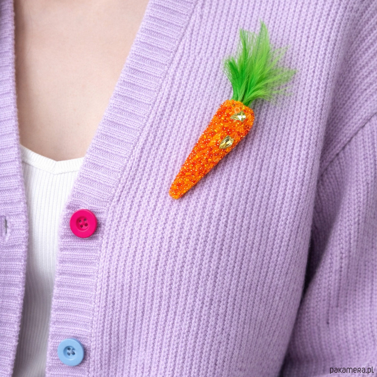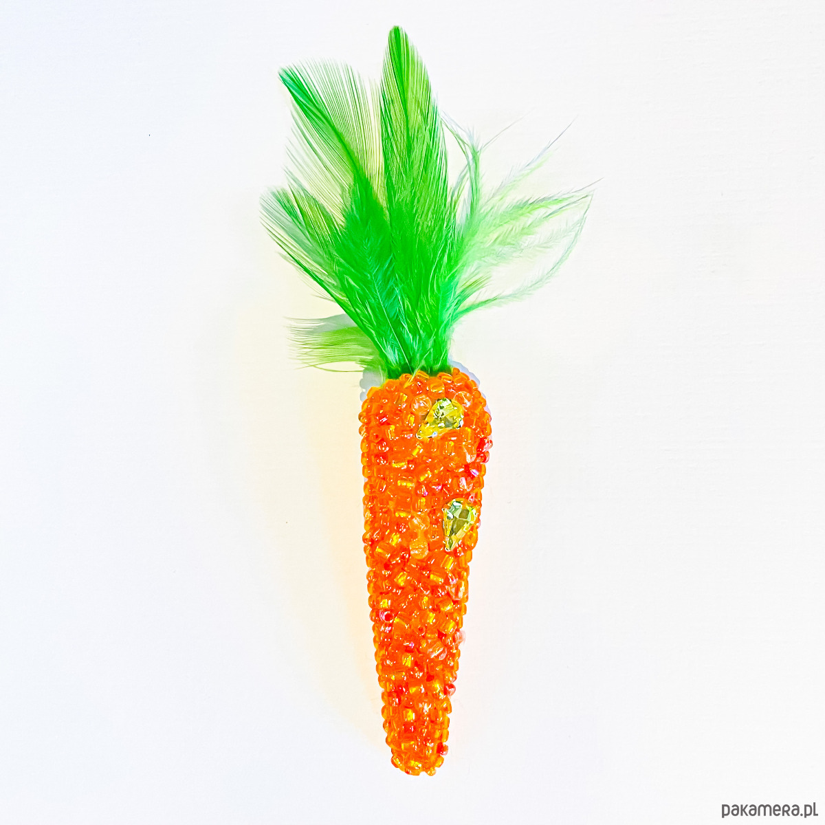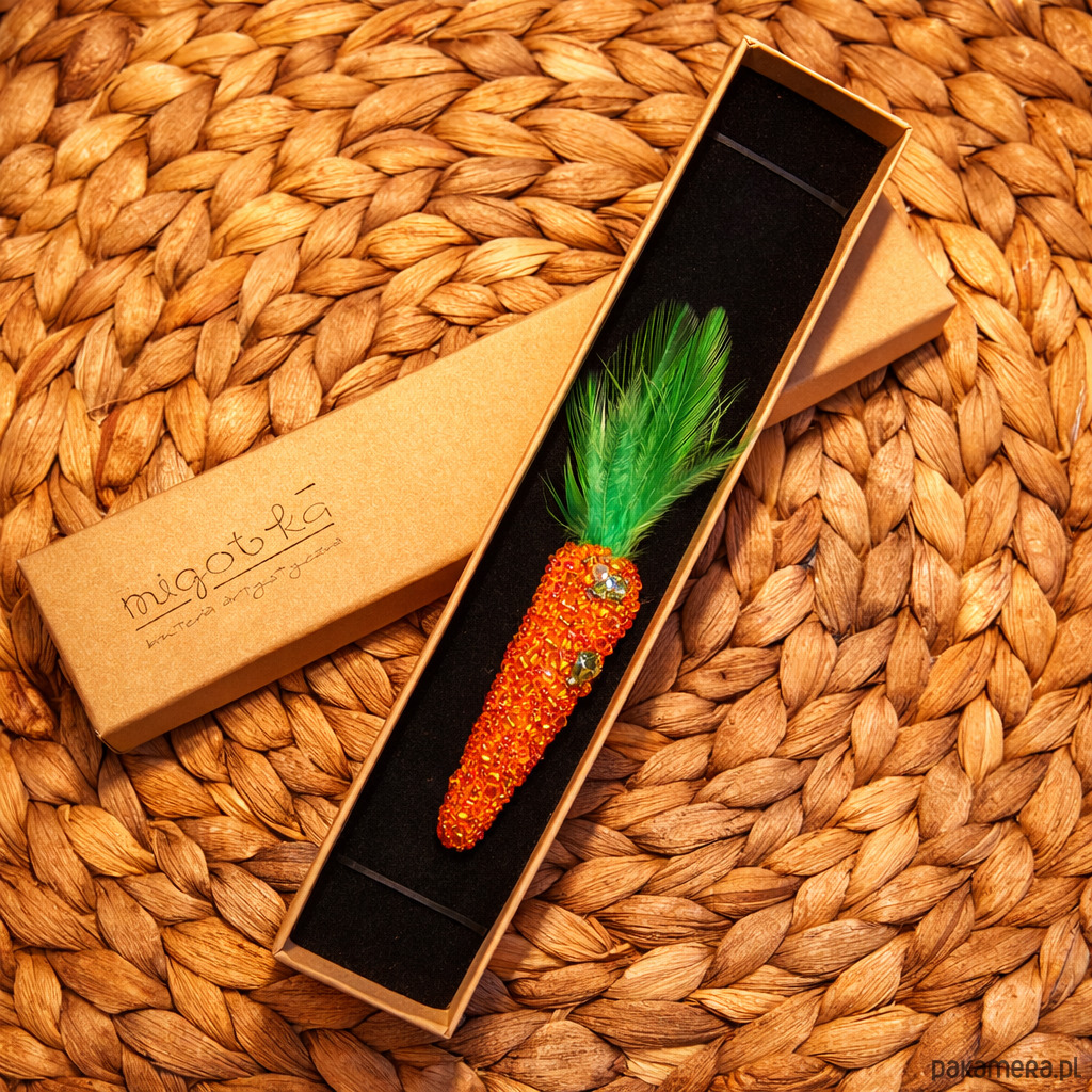 Ręcznie wykonana broszka w kształcie marchewki, stworzona techniką haftu koralikowego. Drobne, połyskujące koraliki nadają jej wyjątkowej faktury i charakteru, a zielone piórka tworzą lekkie, wiosenne wykończenie.