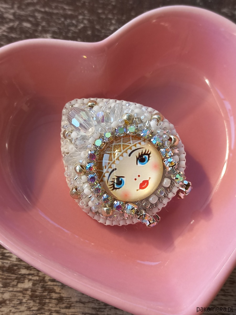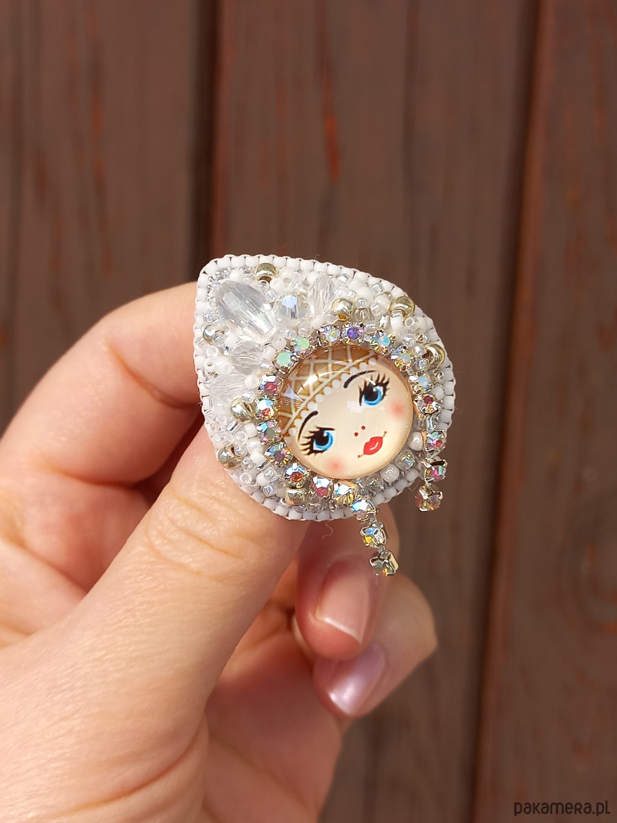 Niepowtarzalna, ręcznie szyta broszka, wykonana metodą haftu koralikowego - Matrioszka w ozdobnym czepcu. Każdy koralik wyszywany jest pojedynczo, dzięki czemu ozdoba jest unikatowa i wyjątkowa. Broszka ma wielkość około 3,5 cm długości i około 3 cm szerokości, wykończenia stalowe w kolorze srebrnym, zapięcie typu agrafka. Od spodu podszyta jest filcem.