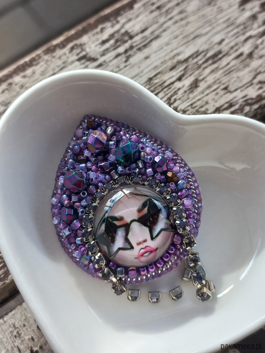 Niepowtarzalna, ręcznie szyta broszka, wykonana metodą haftu koralikowego - Matrioszka w ozdobnym czepcu. Każdy koralik wyszywany jest pojedynczo, dzięki czemu ozdoba jest unikatowa i wyjątkowa. Broszka ma wielkość około 4,5 cm długości i około 3,5 cm szerokości, wykończenia stalowe w kolorze srebrnym, zapięcie typu agrafka. Od spodu podszyta jest filcem.