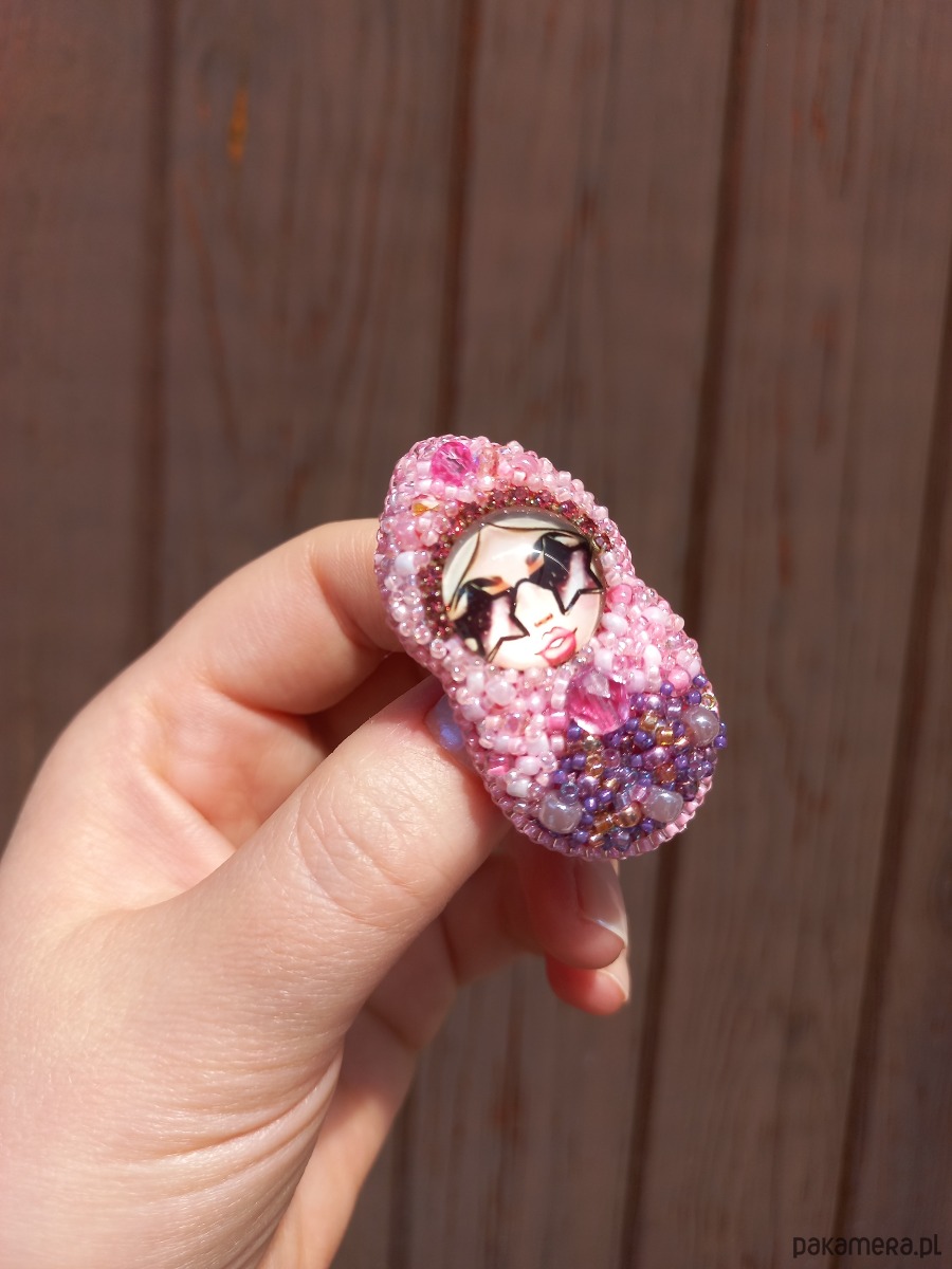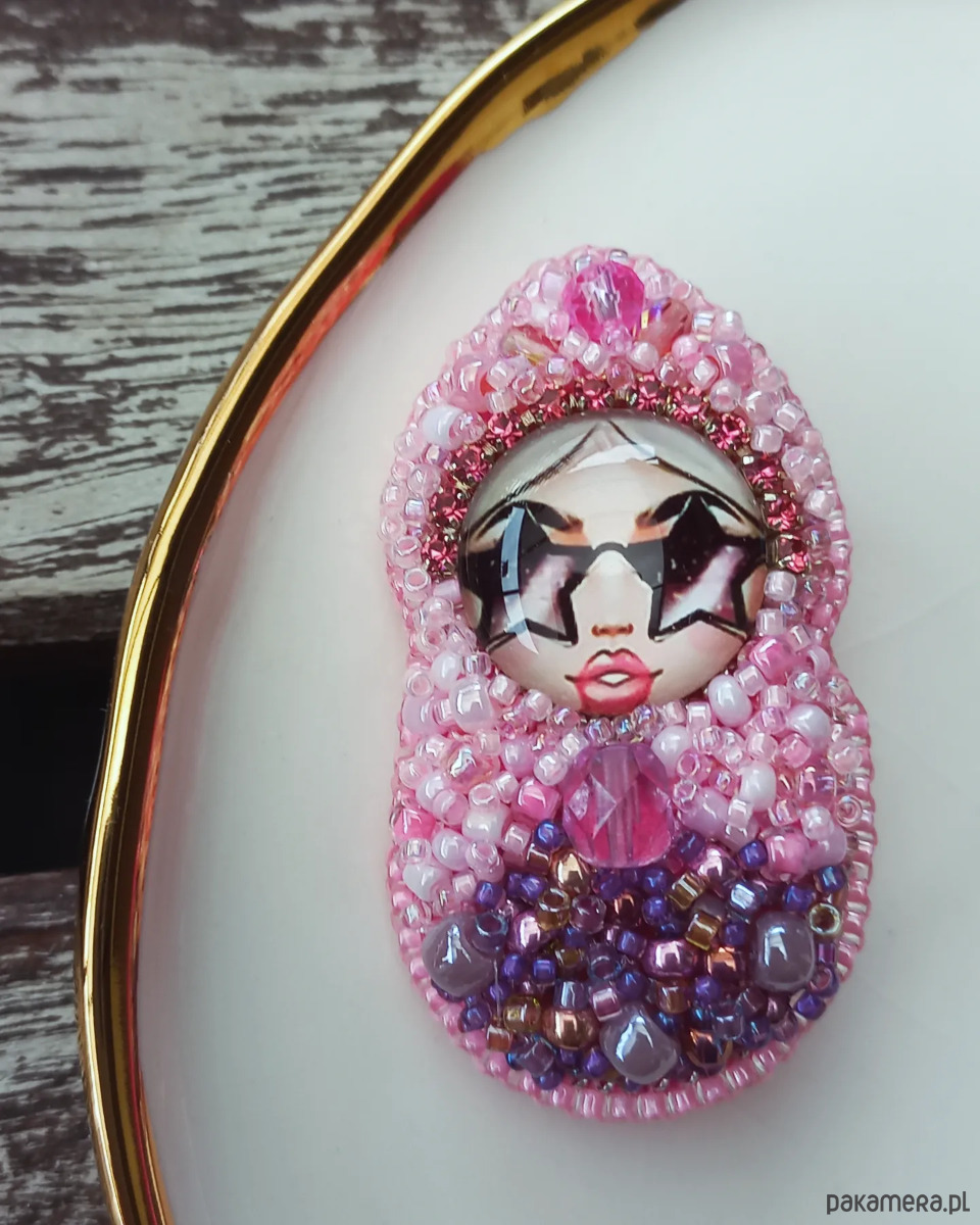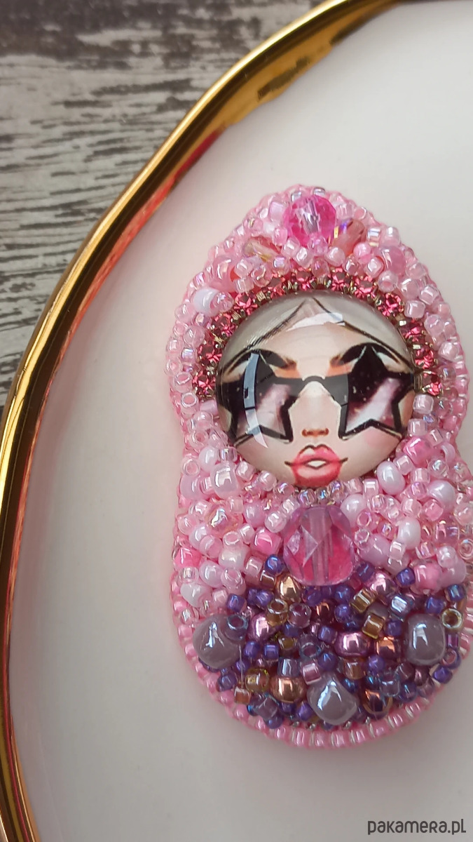 Niepowtarzalna, ręcznie szyta broszka, wykonana metodą haftu koralikowego - Matrioszka laleczka. Każdy koralik wyszywany jest pojedynczo, dzięki czemu ozdoba jest unikatowa i wyjątkowa. Broszka ma wielkość około 4,5 cm długości i około 2,5 cm szerokości, wykończenia stalowe w kolorze srebrnym, zapięcie typu agrafka. Od spodu podszyta jest filcem.