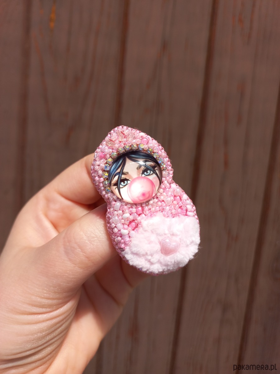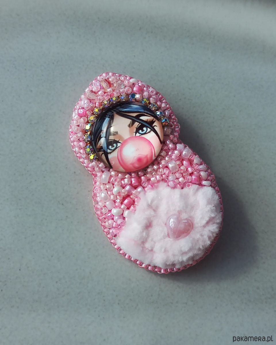 Niepowtarzalna, ręcznie szyta broszka, wykonana metodą haftu koralikowego - Matrioszka laleczka z różowym futerkiem. Każdy koralik wyszywany jest pojedynczo, dzięki czemu ozdoba jest unikatowa i wyjątkowa. Broszka ma wielkość około 5,5 cm długości i około 3 cm szerokości, wykończenia stalowe w kolorze srebrnym, zapięcie typu agrafka. Od spodu podszyta jest filcem.