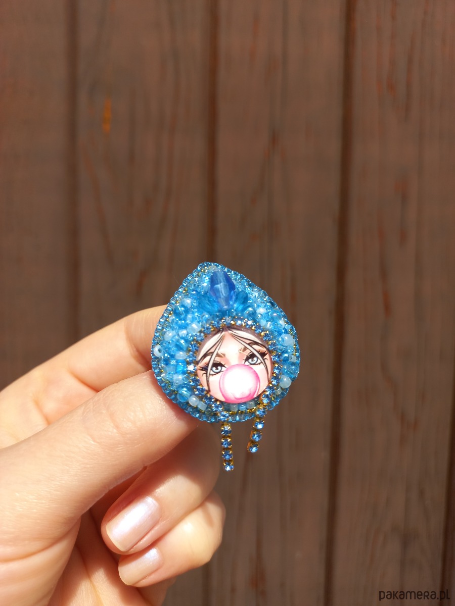 Niepowtarzalna, ręcznie szyta broszka, wykonana metodą haftu koralikowego - Matrioszka w ozdobnym czepcu. Każdy koralik wyszywany jest pojedynczo, dzięki czemu ozdoba jest unikatowa i wyjątkowa. Broszka ma wielkość około 3,5 cm długości i około 3 cm szerokości, wykończenia stalowe w kolorze złotym, zapięcie typu agrafka. Od spodu podszyta jest filcem.
