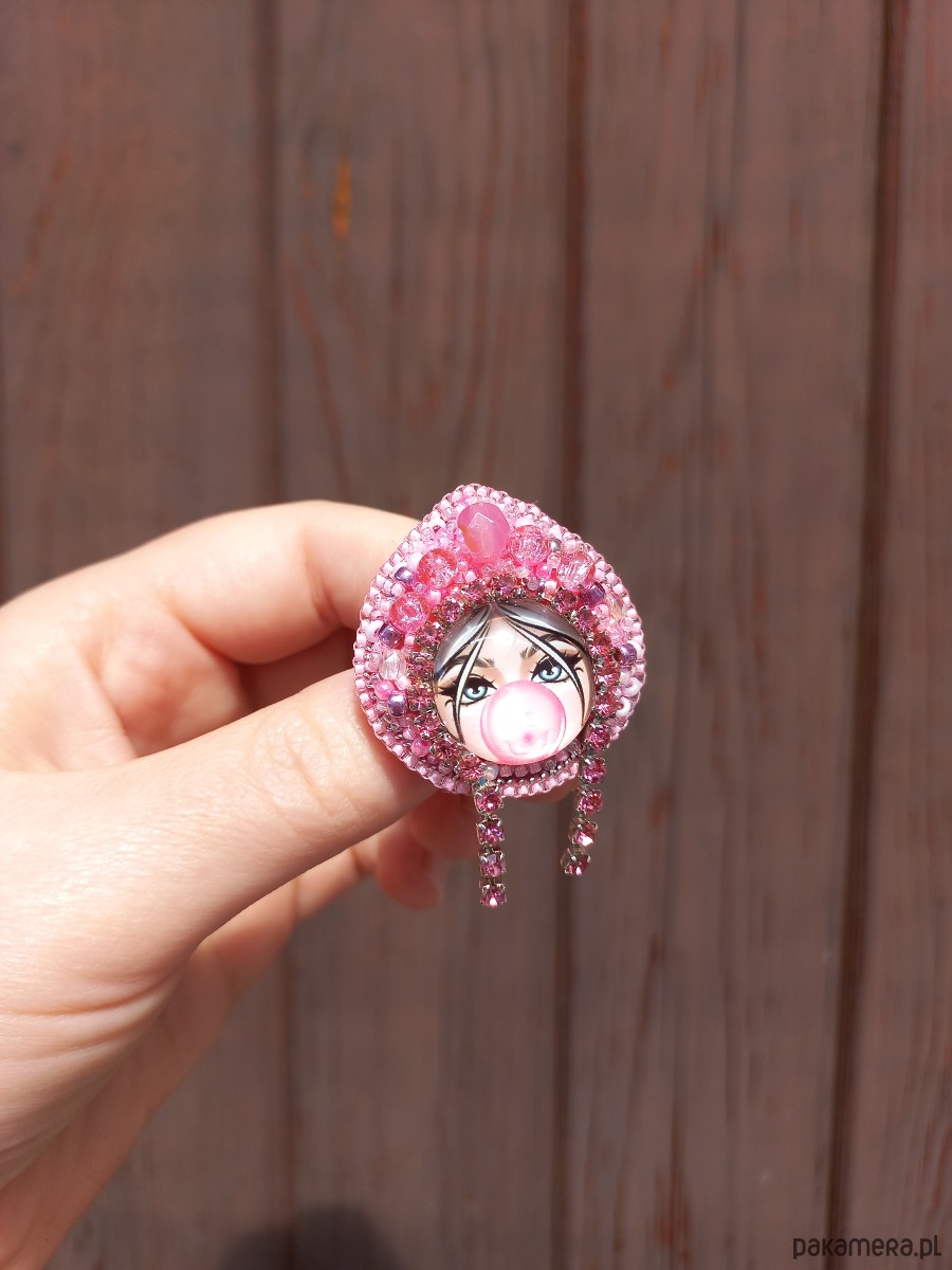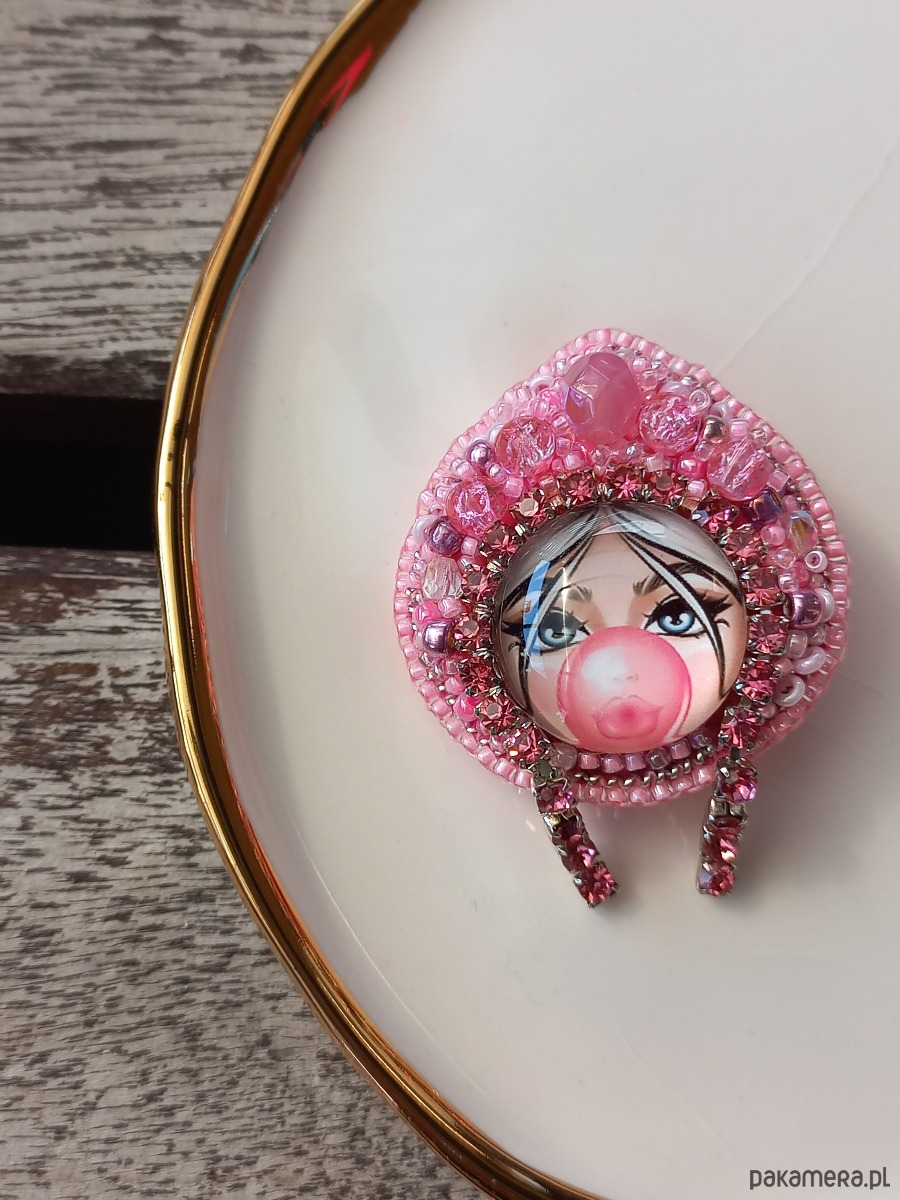 Niepowtarzalna, ręcznie szyta broszka, wykonana metodą haftu koralikowego - Matrioszka w ozdobnym czepcu. Każdy koralik wyszywany jest pojedynczo, dzięki czemu ozdoba jest unikatowa i wyjątkowa. Broszka ma wielkość około 3,5 cm długości i około 3 cm szerokości, wykończenia stalowe w kolorze srebrnym, zapięcie typu agrafka. Od spodu podszyta jest filcem.