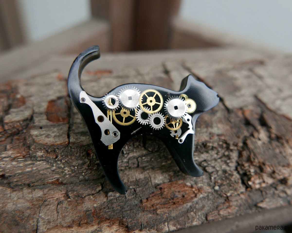 Jeśli nie boisz się czarnych kotów, to broszka właśnie dla Ciebie. Wykonana z żywicy epoksydowej i części zegarka. Wymiary 4 x 4 cm.