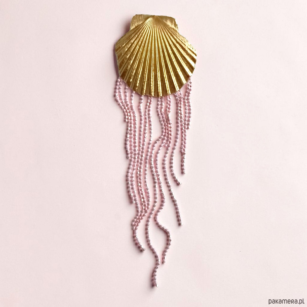 zjawiskowa broszka - inspirowana meduzą - wykonana z prawdziwej muszli, która została przeze mnie pomalowana jednostronnie na złoty kolor, dodatkowo ozdobiona pięknie poruszającymi się łańcuszkami.