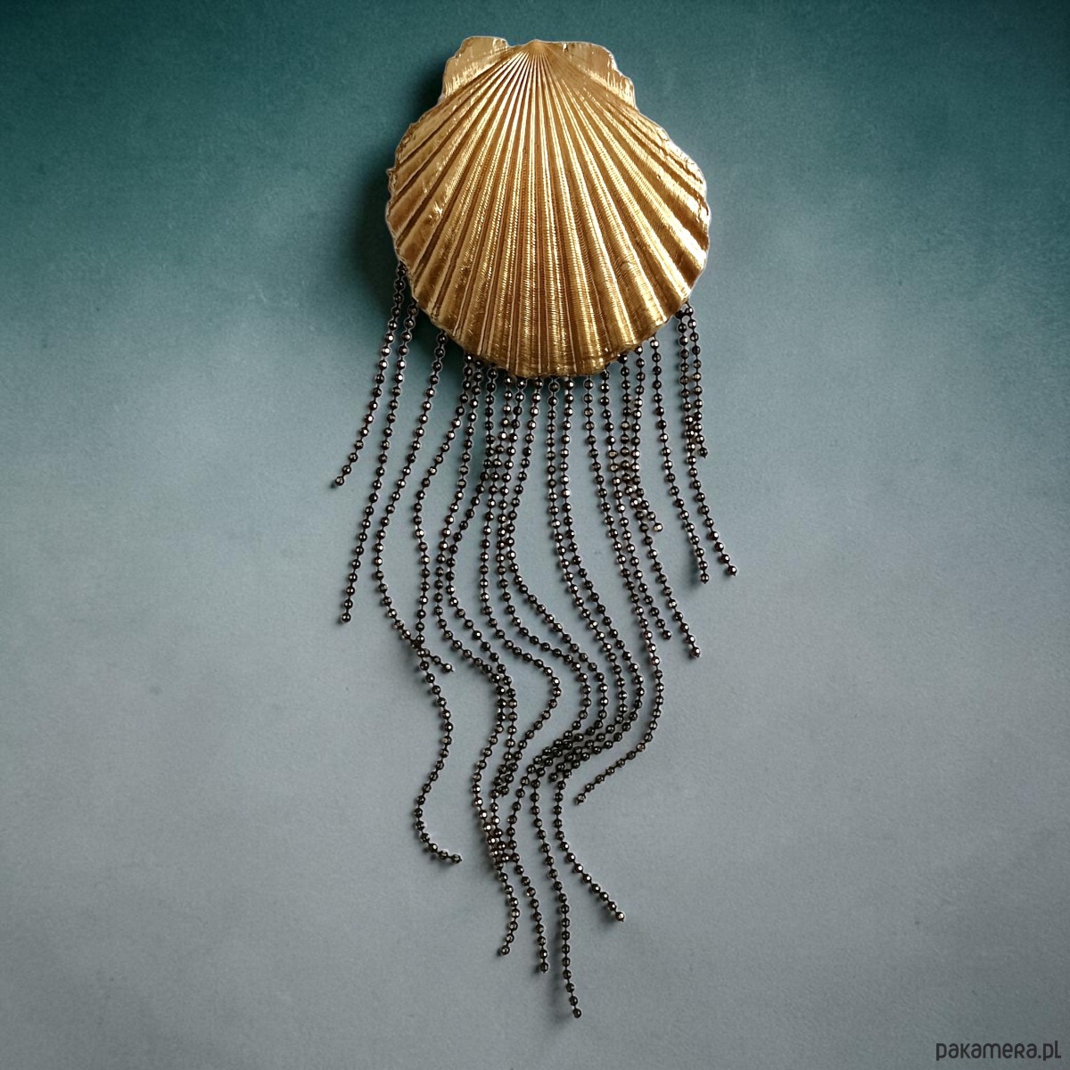 zjawiskowa broszka - inspirowana meduzą - wykonana z prawdziwej muszli, która została przeze mnie pomalowana jednostronnie na złoty kolor, dodatkowo ozdobiona pięknie poruszającymi się łańcuszkami.