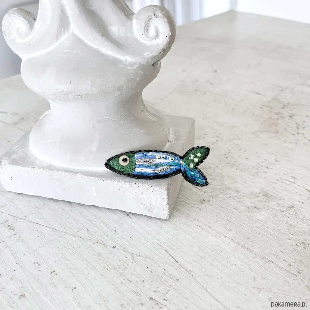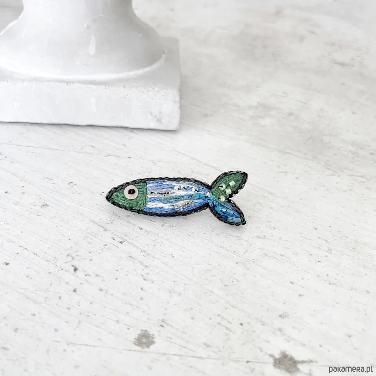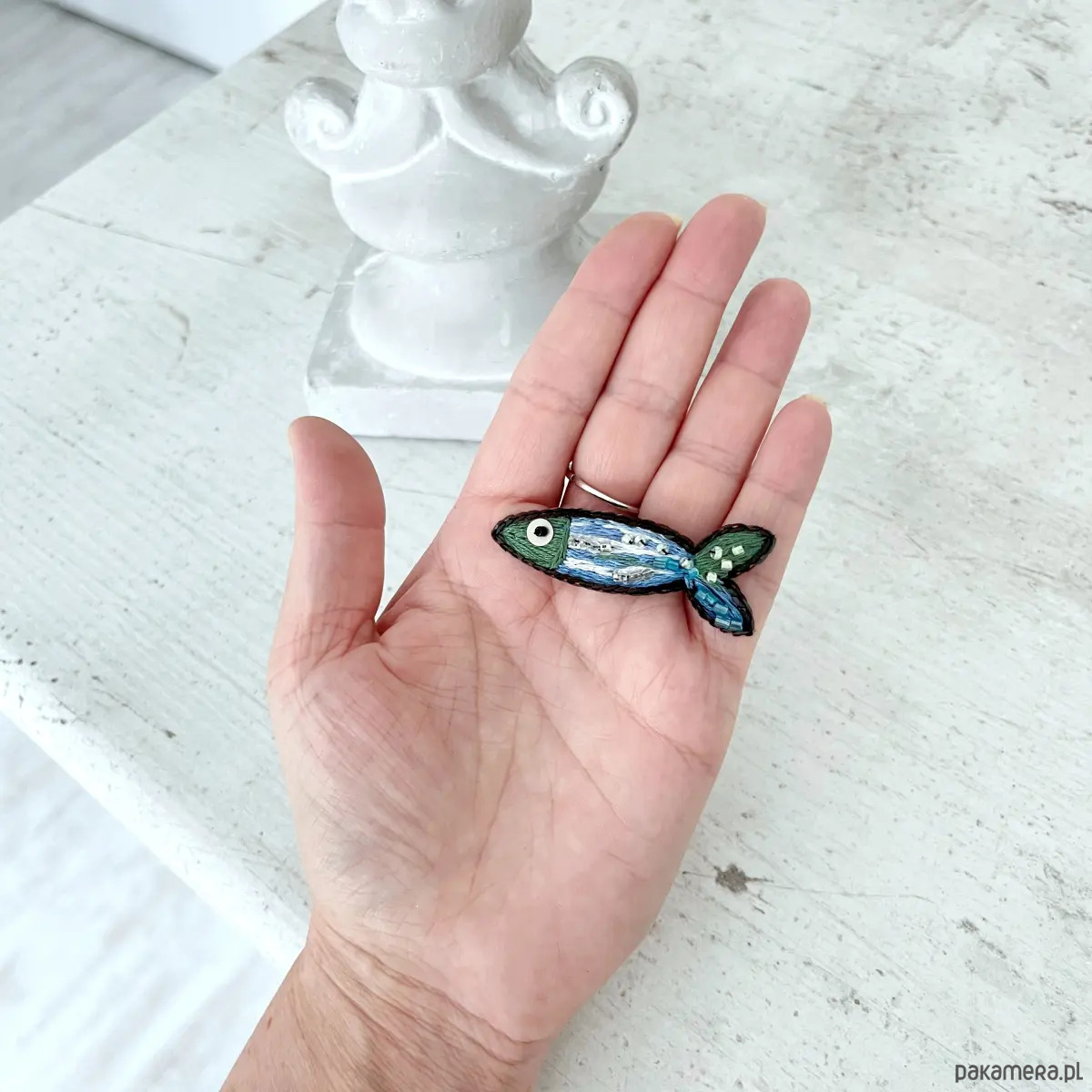 Broszka mini RYBKA 8 ręcznie haftowana przypinka rękodzieło śledzik