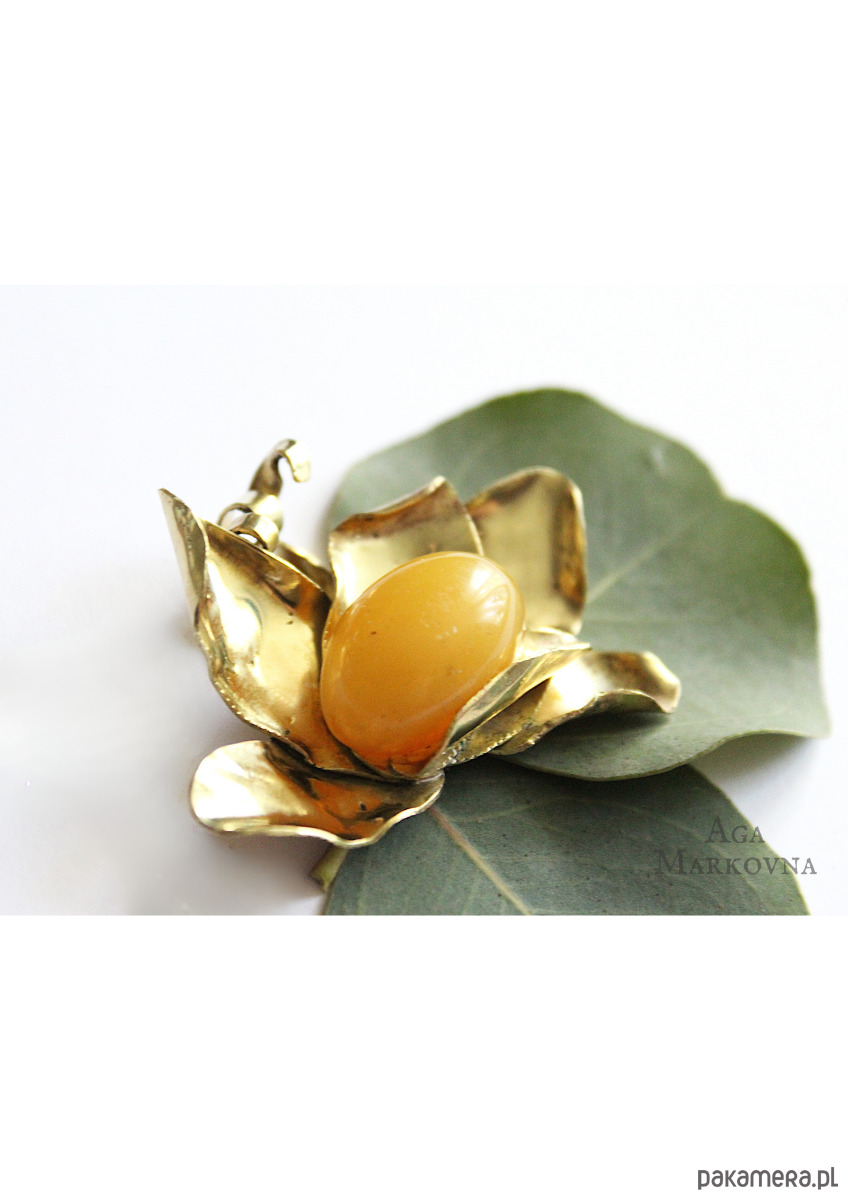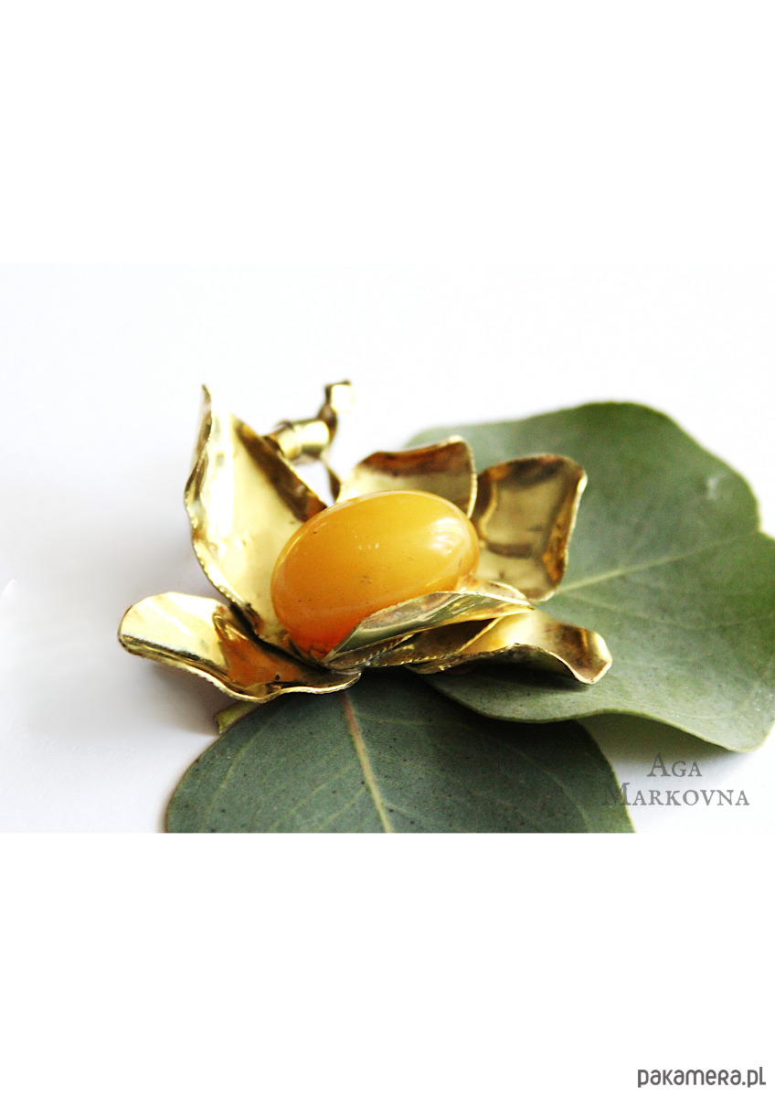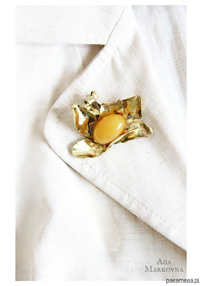 Broszka mosiężna "Kwiat" z Bursztynem Bałtyckim