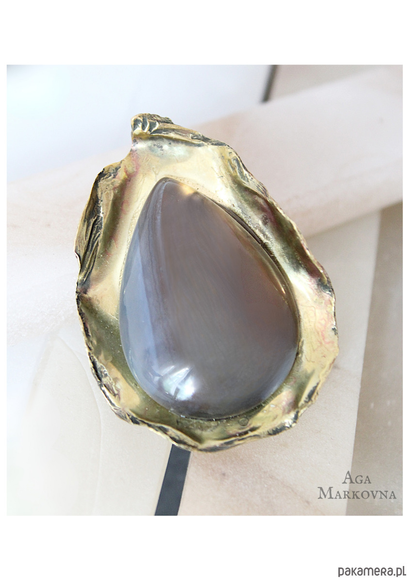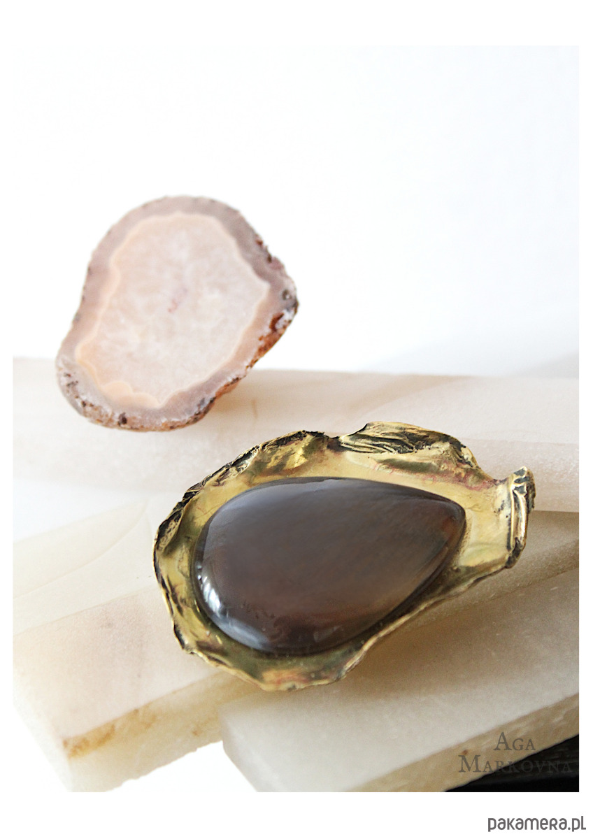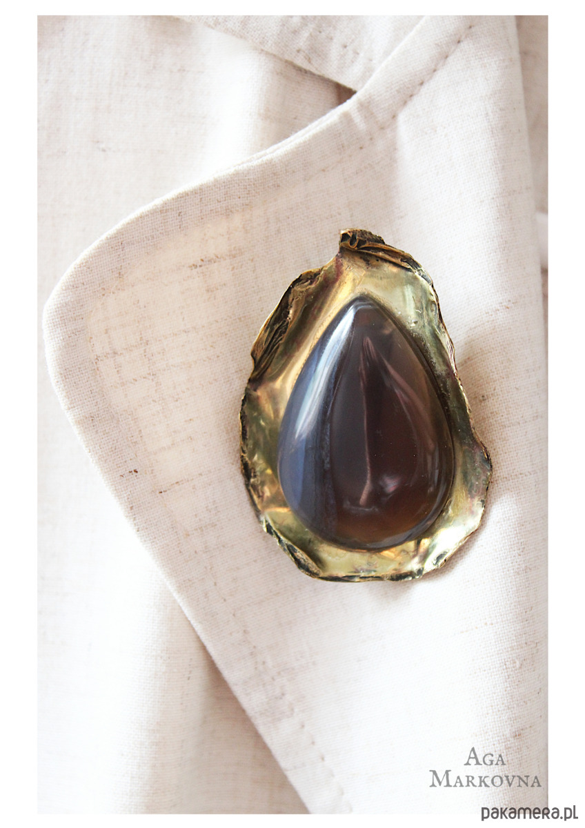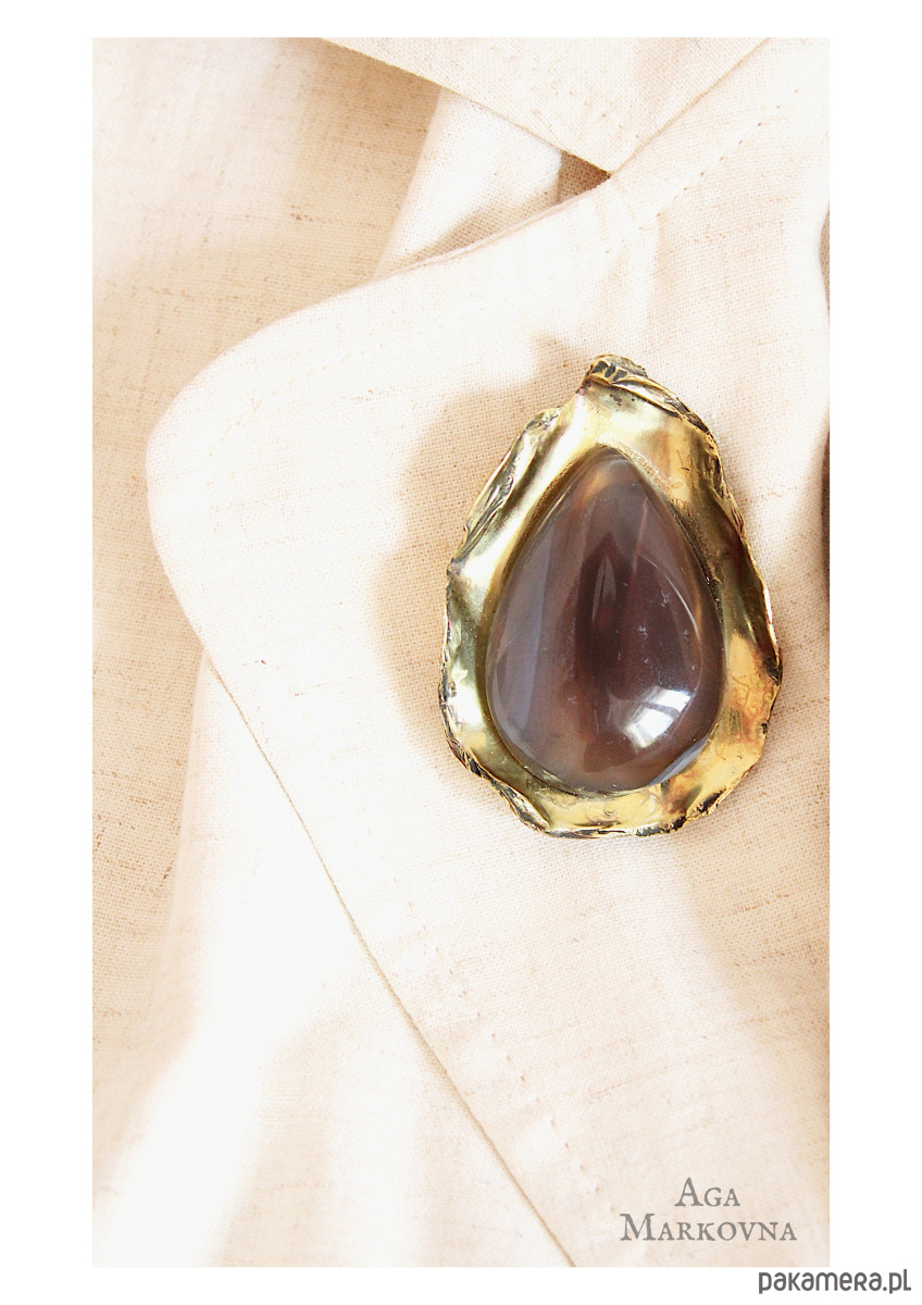 Gustowna, elegancka broszka ręcznie kształtowana z mosiądzu, której sercem jest naturalny, przepiękny kamień naturalnego Agatu o brunatnej barwie z subtelnymi, białymi refleksami.