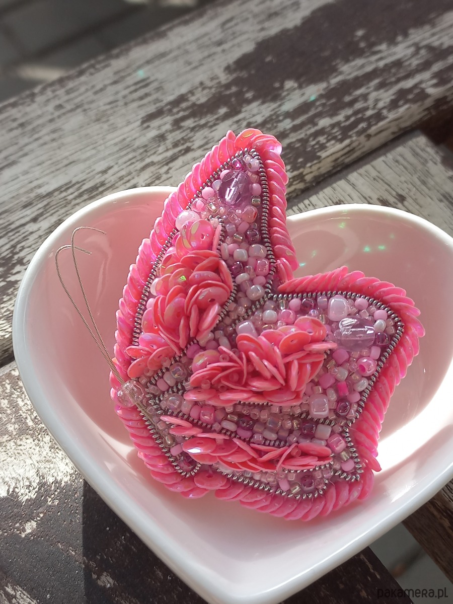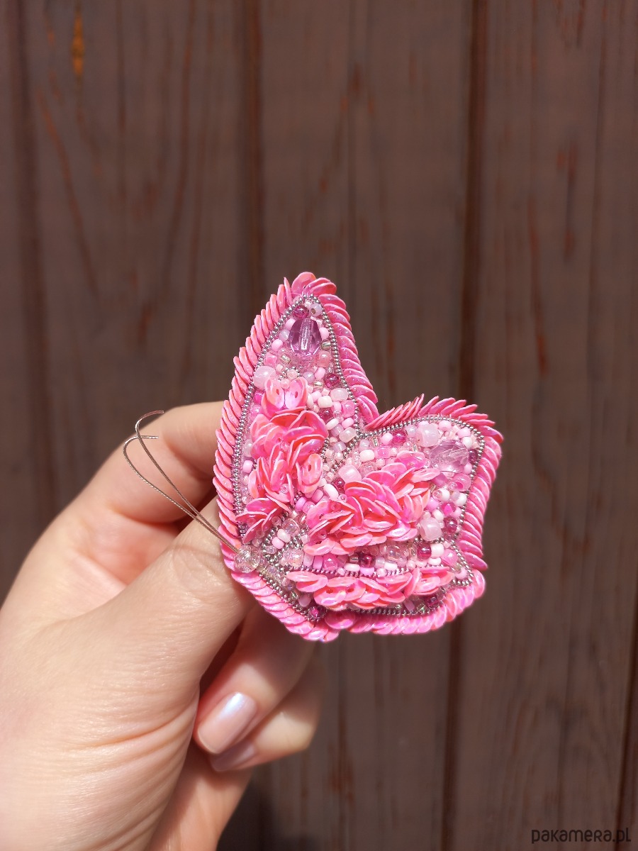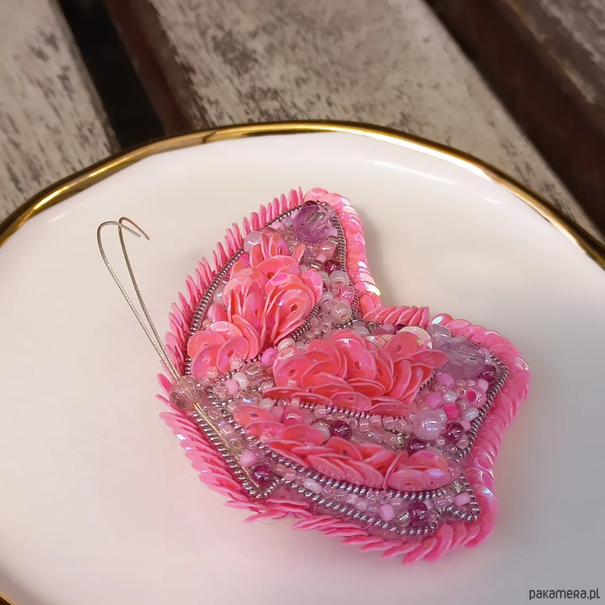 Niepowtarzalna, ręcznie szyta broszka, wykonana metodą haftu koralikowego. Każdy koralik wyszywany jest pojedynczo, dzięki czemu ozdoba jest unikatowa i wyjątkowa. Broszka ma wielkość około 6 cm długości i około 5 cm szerokości, wykończenia stalowe w kolorze srebrnym, zapięcie typu agrafka. Od spodu podszyta jest filcem.