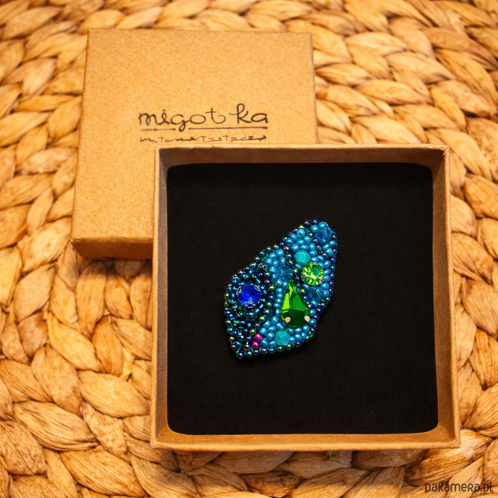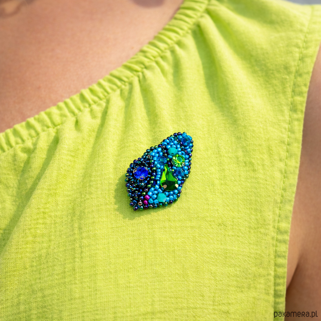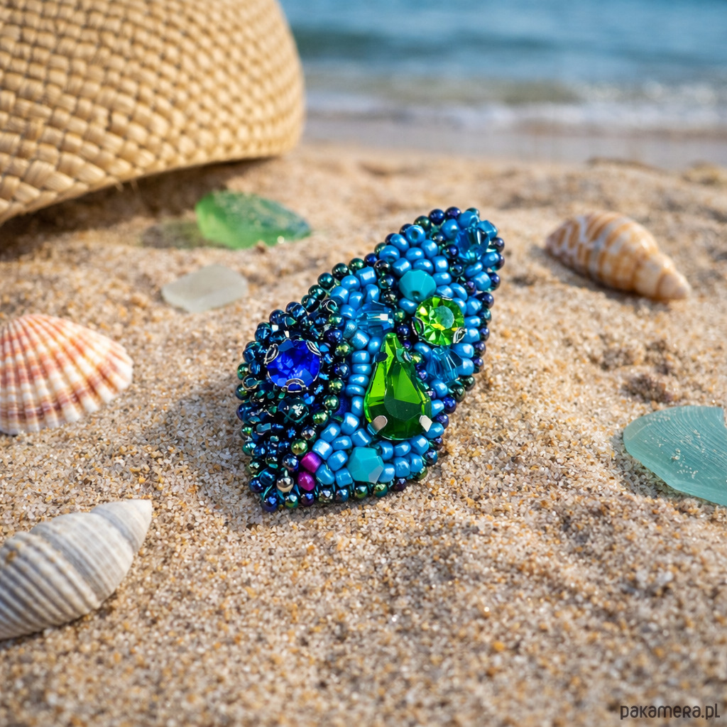 Unikatowa broszka w kształcie muszelki, wykonana ręcznie techniką haftu koralikowego. Połączenie turkusów, błękitów i soczystej zieleni przywodzi na myśl letnie wybrzeże i morską bryzę. Drobne koraliki oraz kryształowe akcenty pięknie odbijają światło, nadając biżuterii subtelny blask.
