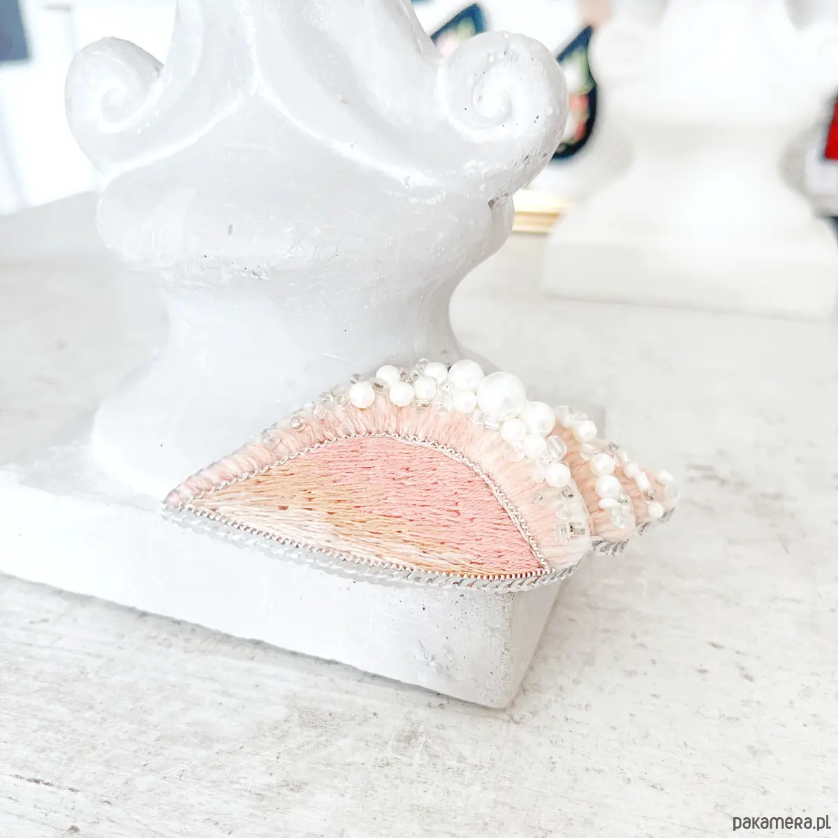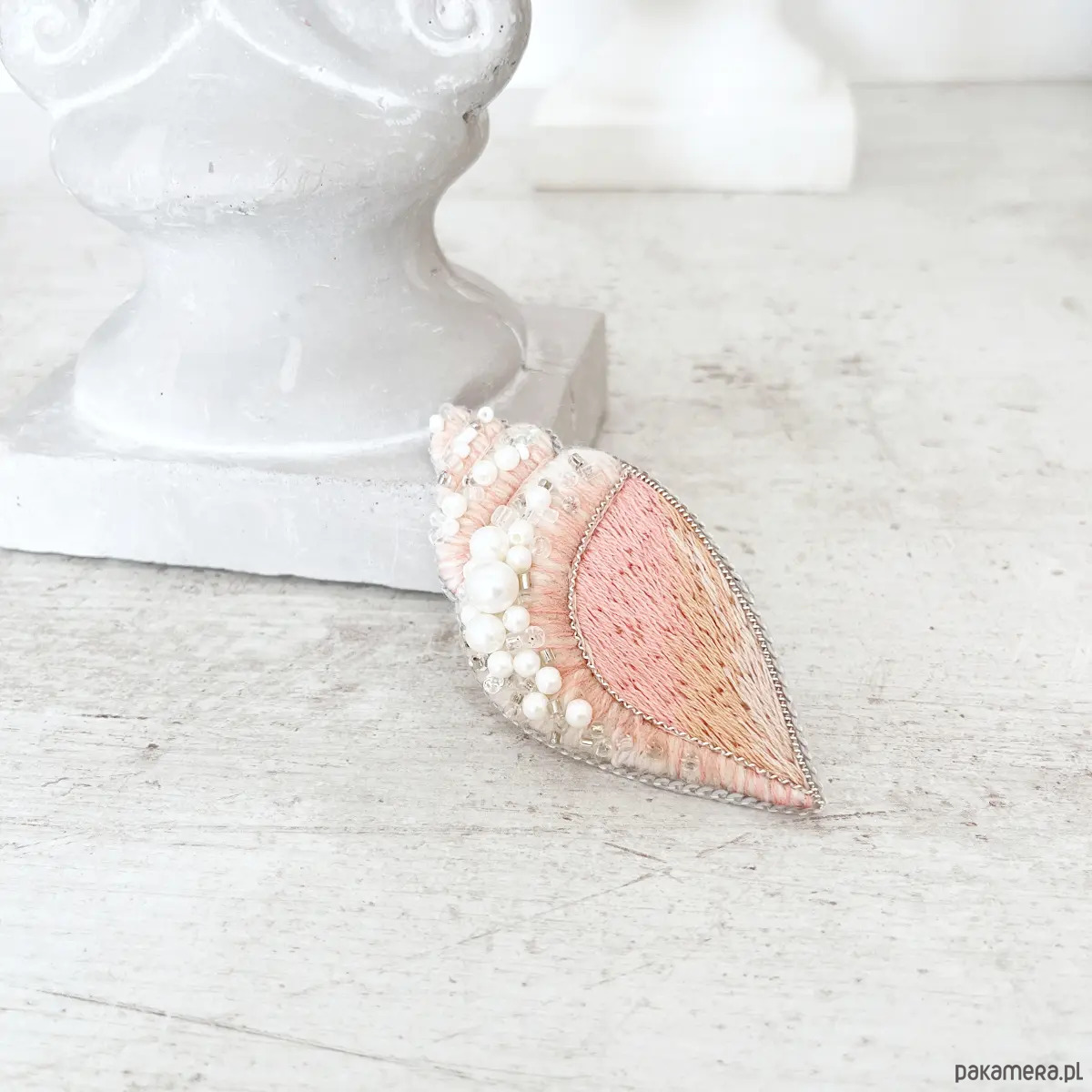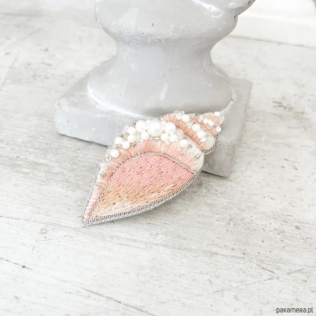 – ręcznie haftowana broszka w kształcie muszli