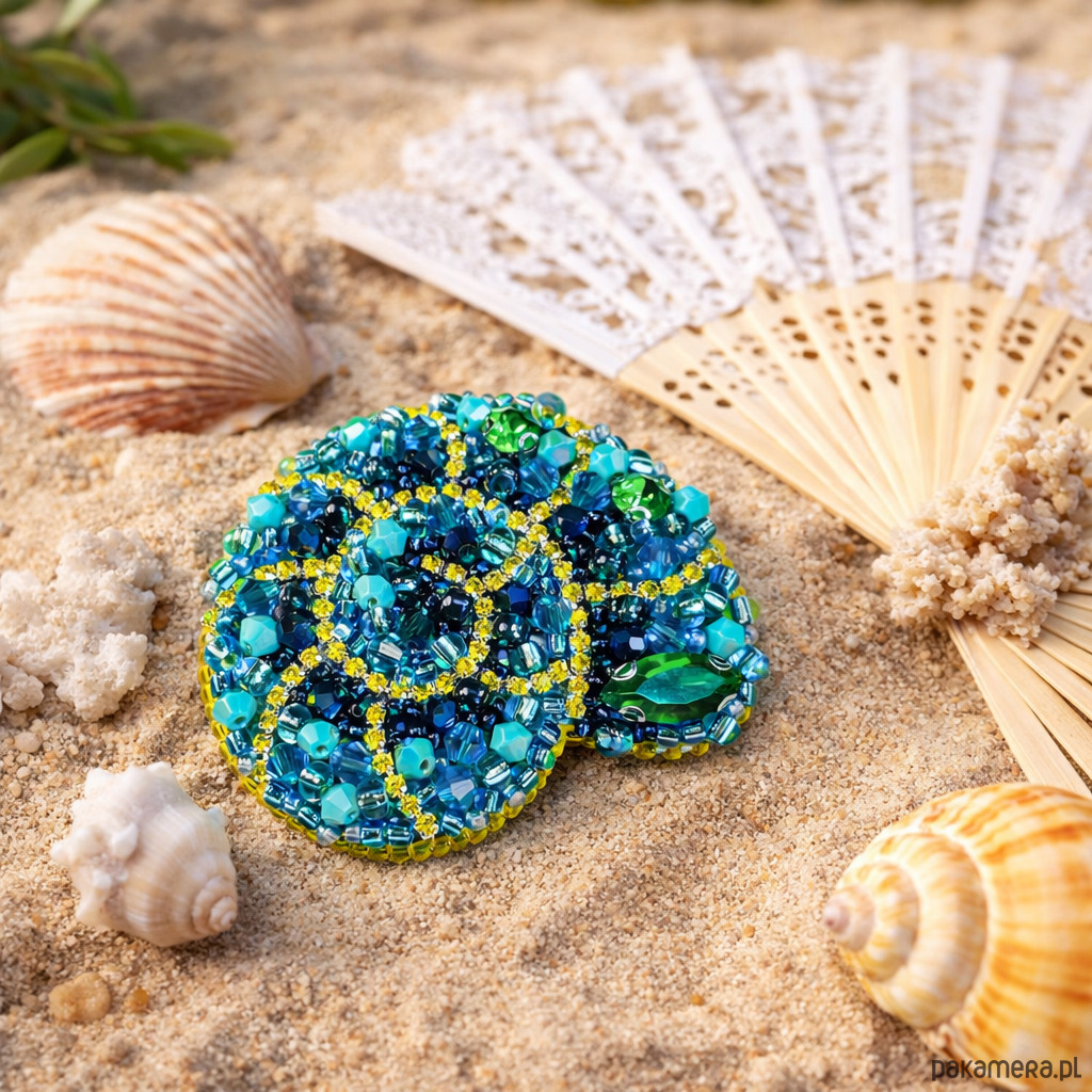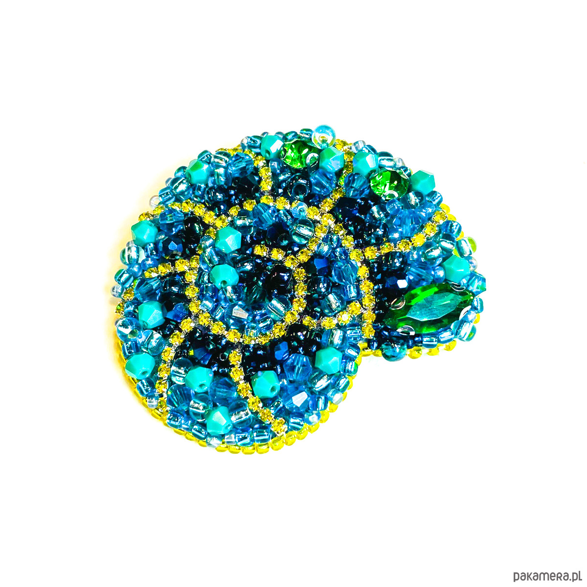 Ręcznie wykonana broszka w kształcie muszli, stworzona techniką haftu koralikowego. Połączenie odcieni turkusu, błękitu, granatu i zieleni przywodzi na myśl morskie głębiny i letnie wspomnienia znad morza. Delikatnie połyskujące koraliki nadają broszce elegancji i sprawiają, że pięknie odbija światło.