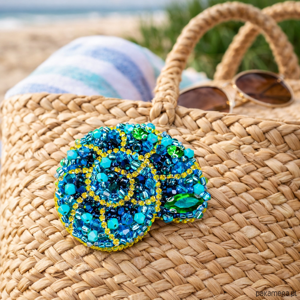 Broszka doskonale sprawdzi się jako oryginalny dodatek do marynarki, sukienki, swetra, apaszki czy torby – szczególnie plażowej lub letniej.