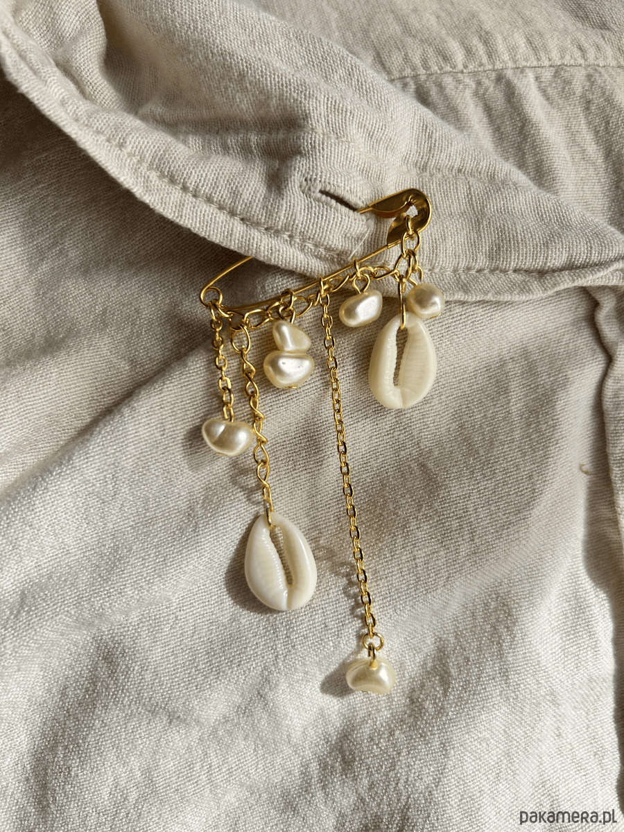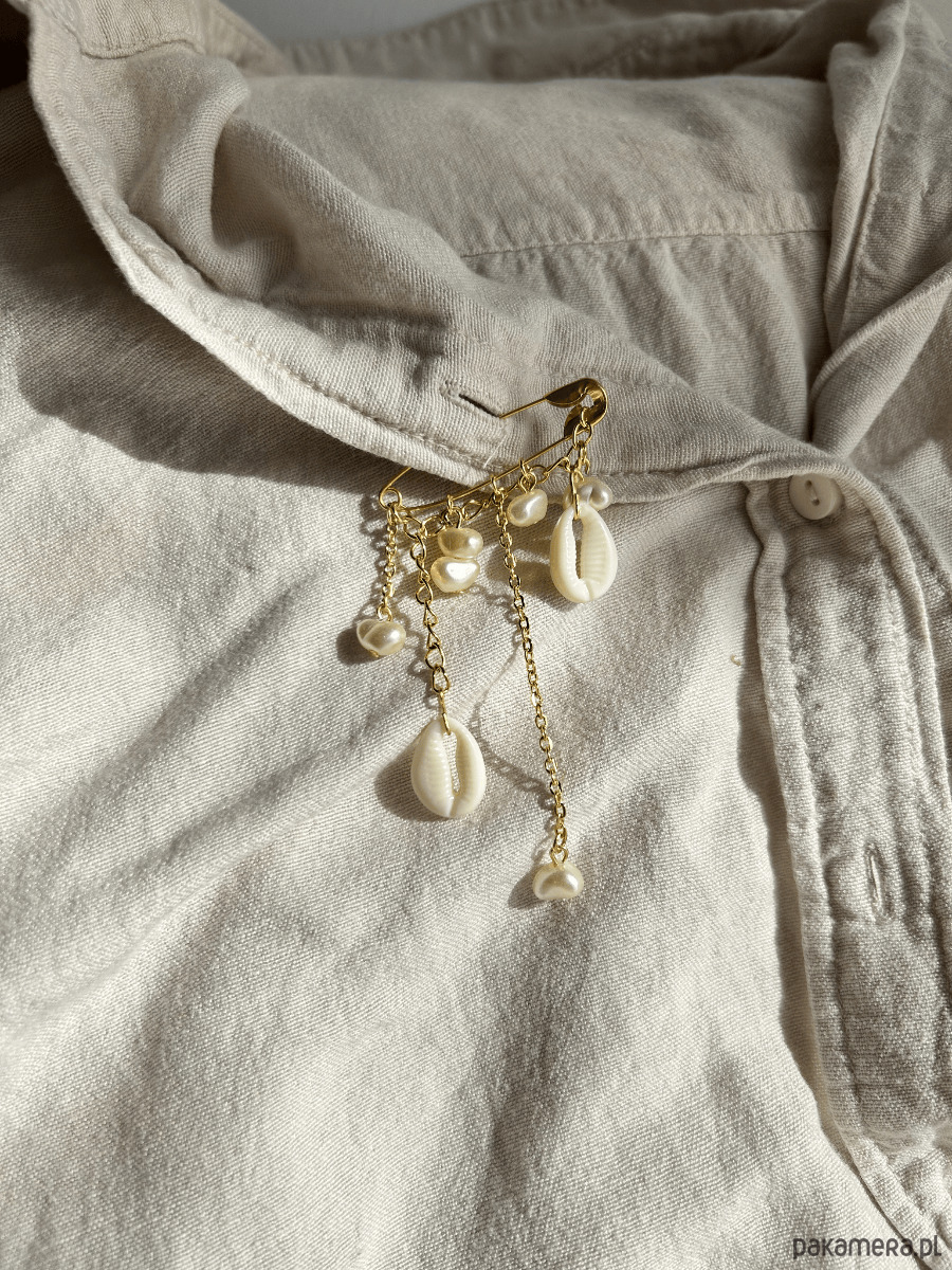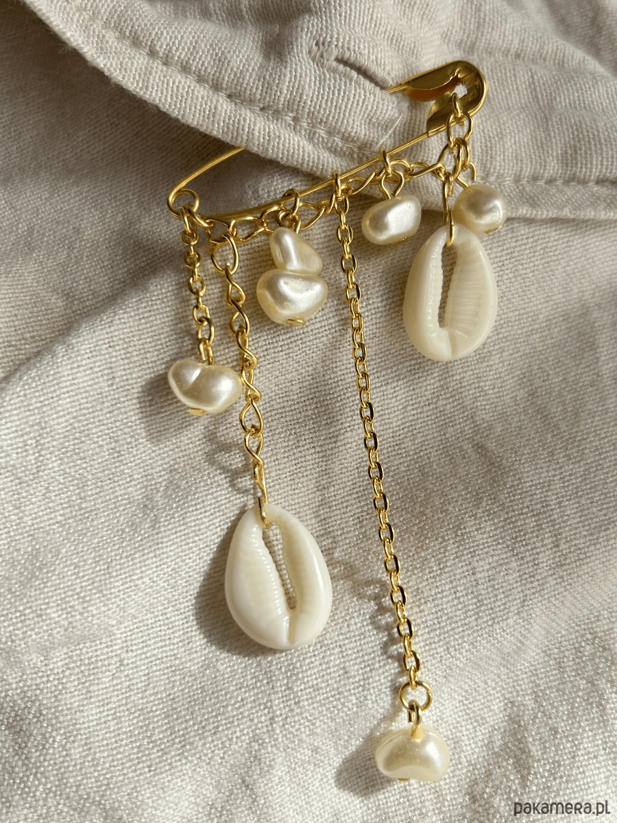 Centralnym punktem broszki jest dekoracyjna agrafka, na której zawieszone zostały starannie dobrane elementy. Całość utrzymana jest w harmonijnej, biało-zlotej kolorystyce przywołującej skojarzenia z morską bryzą, słońcem i wakacyjną swobodą.