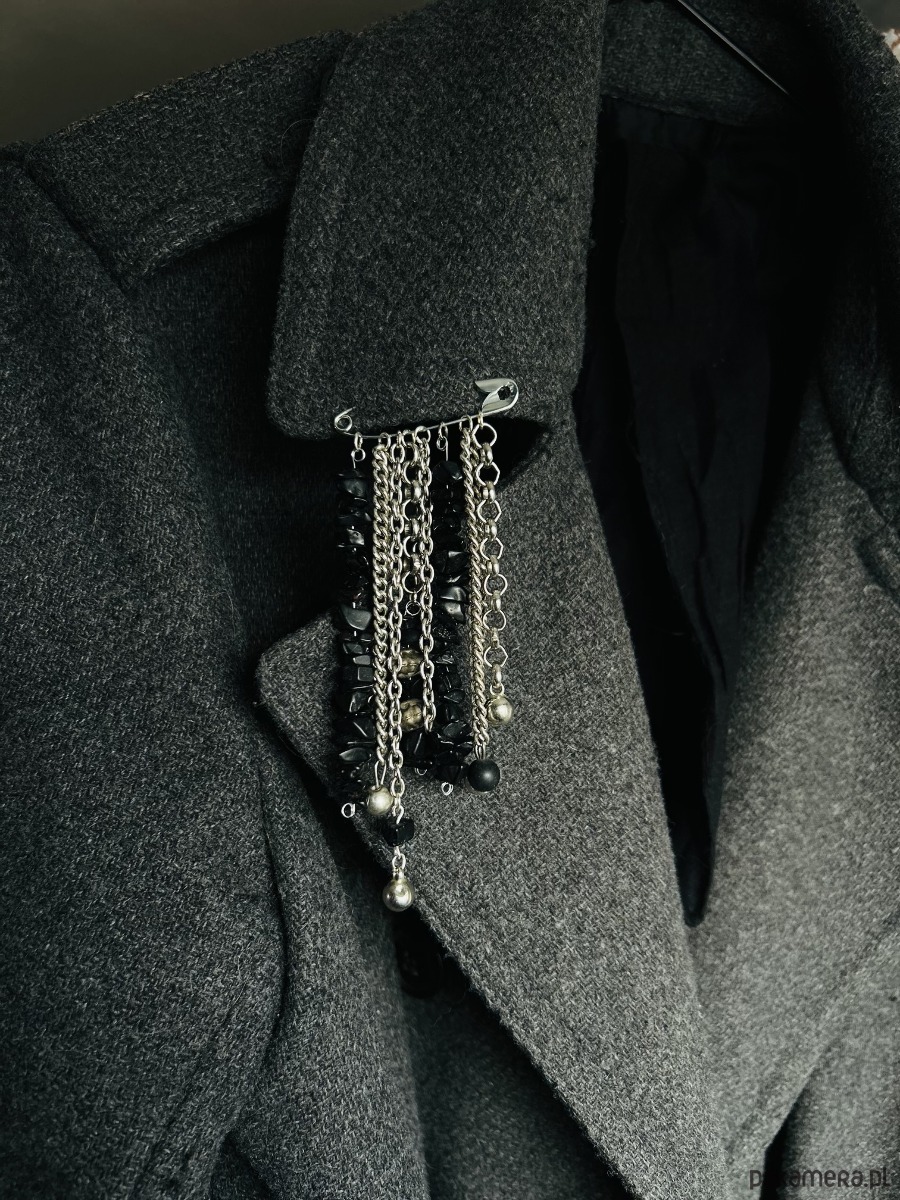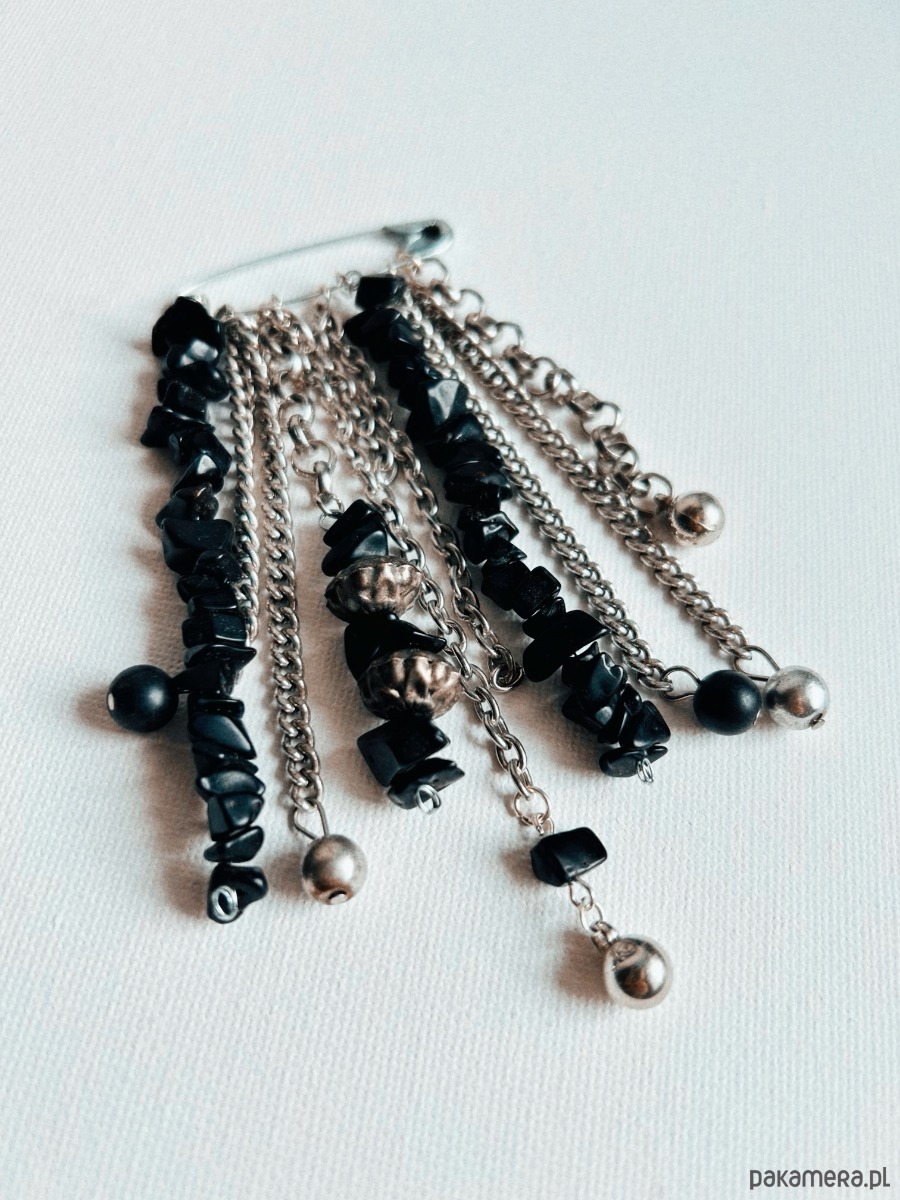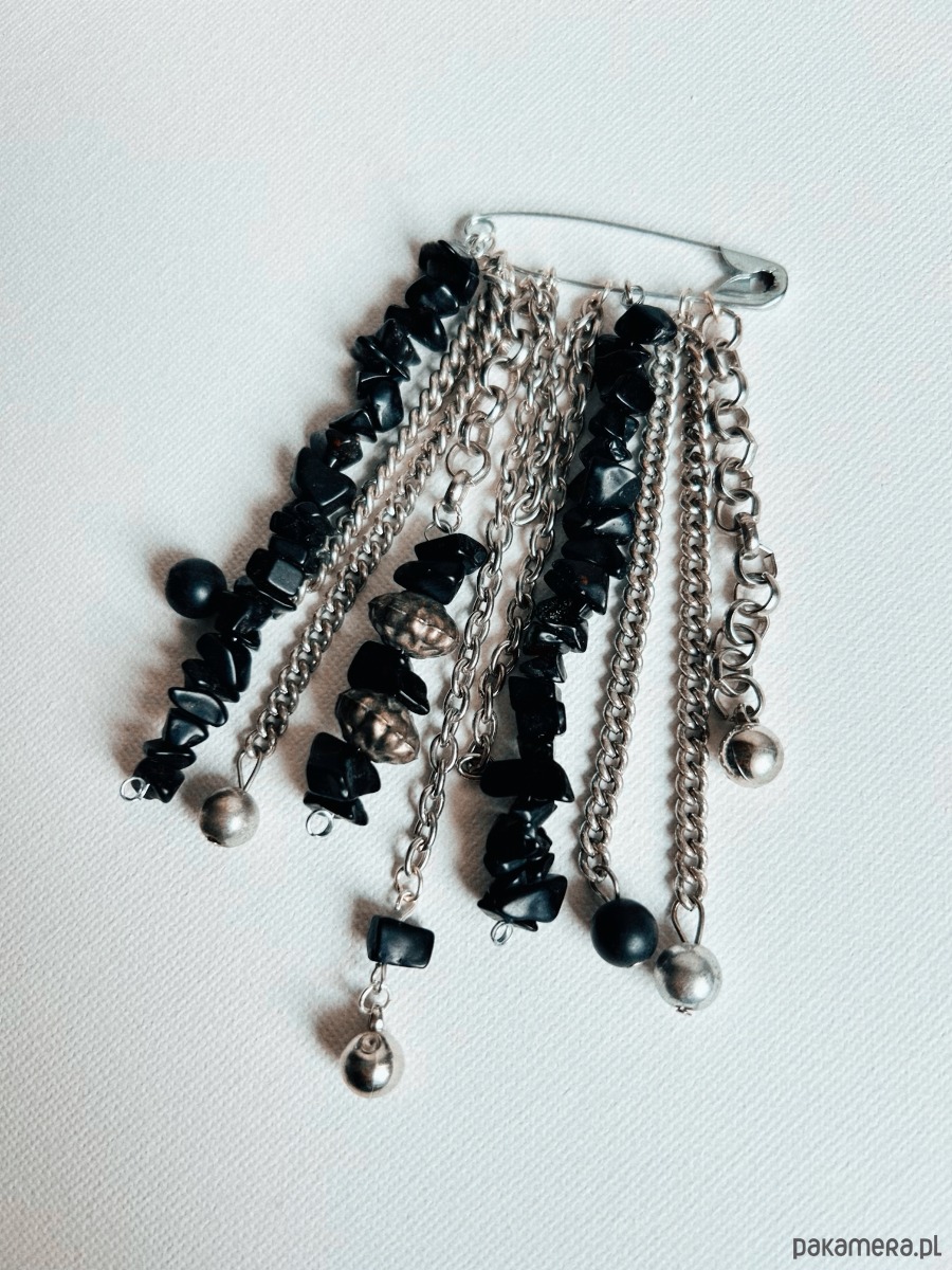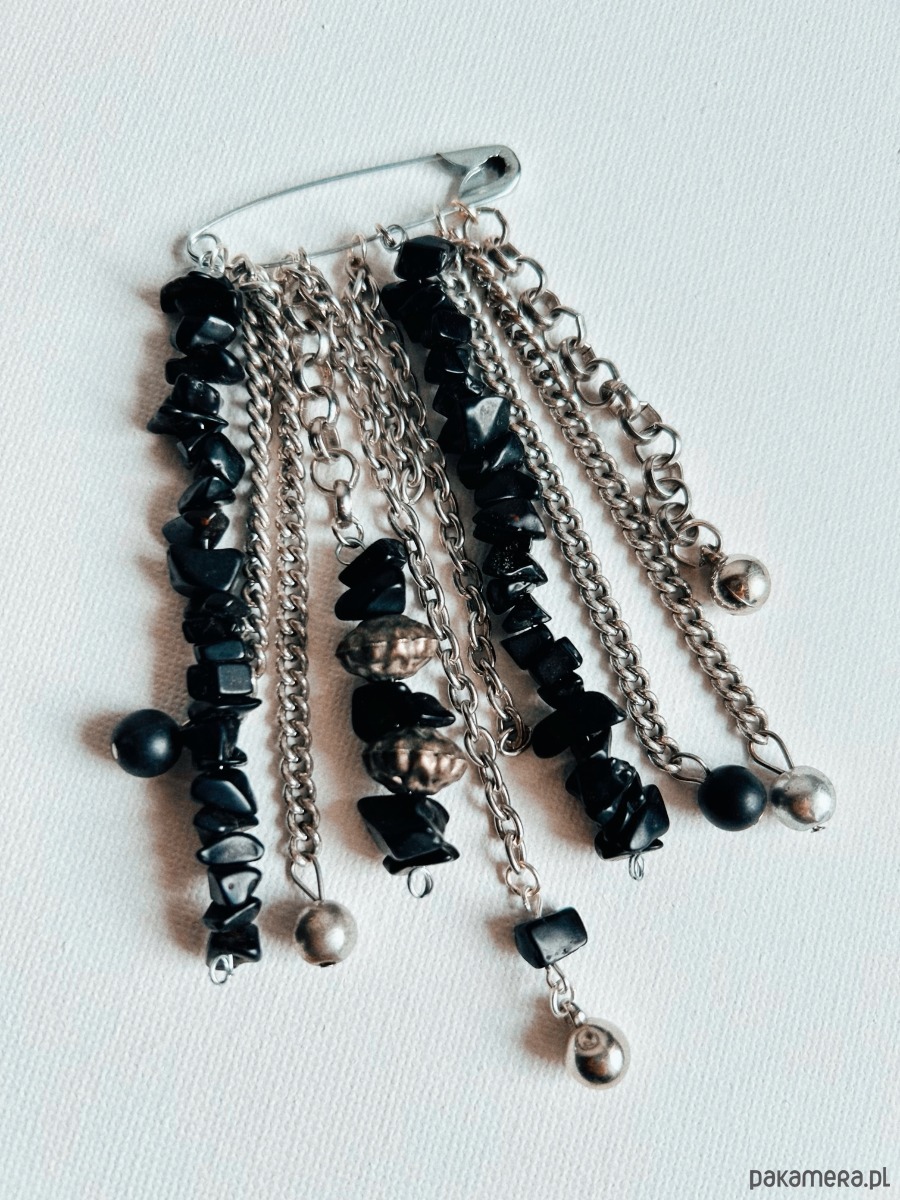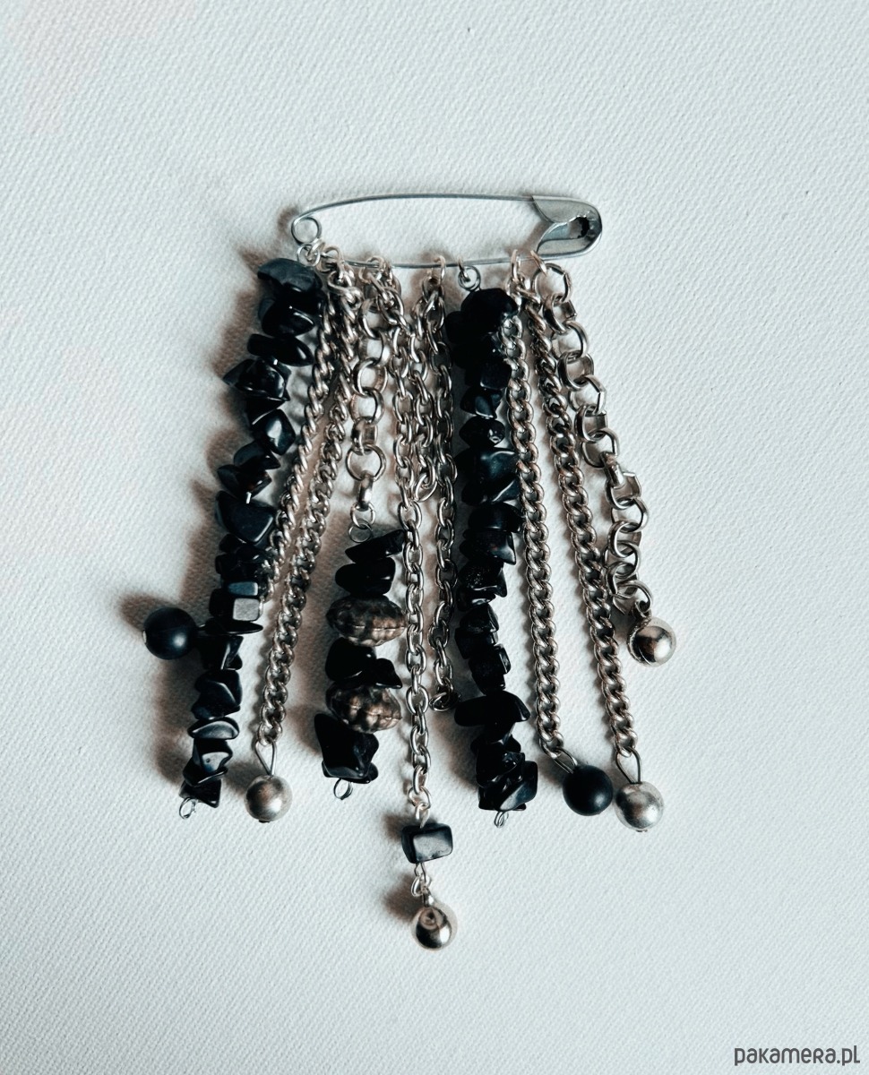 Ręcznie wykonana kompozycja na bazie klasycznej agrafki, w duchu slow fashion i biżuterii artystycznej. Wiszące łańcuszki, opalizujące koraliki i drobne zawieszki tworzą lekko chaotyczny, ale perfekcyjnie wyważony efekt. Każdy element układa się inaczej w zależności od ruchu, tkaniny czy kąta patrzenia, dzięki czemu broszka zachowuje świeżość i ciekawość za każdym razem, gdy ją nosisz.