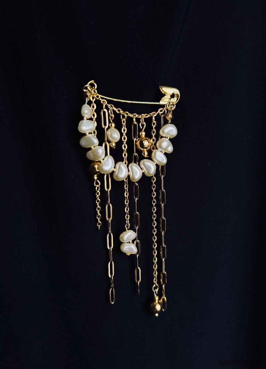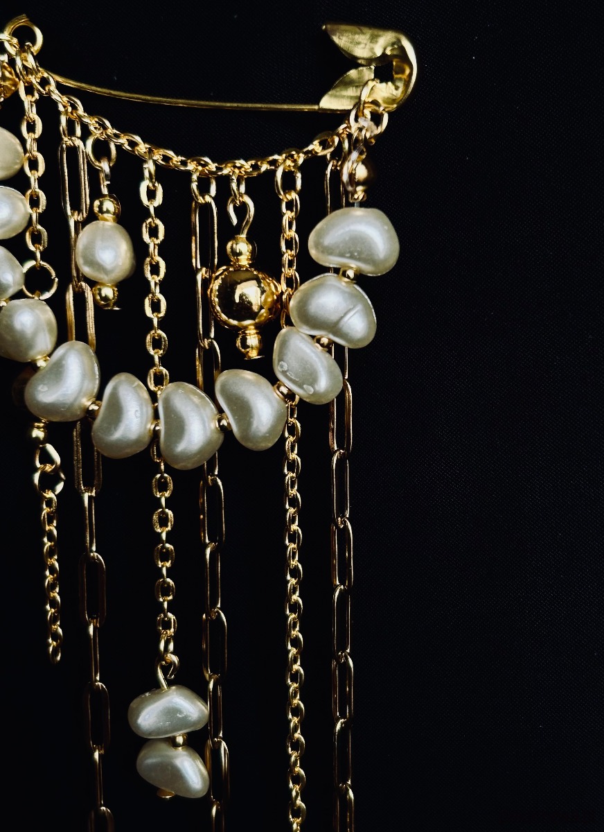 Autorska broszka z agrafką ozdobiona perłami i łańcuszkami różnej grubości.