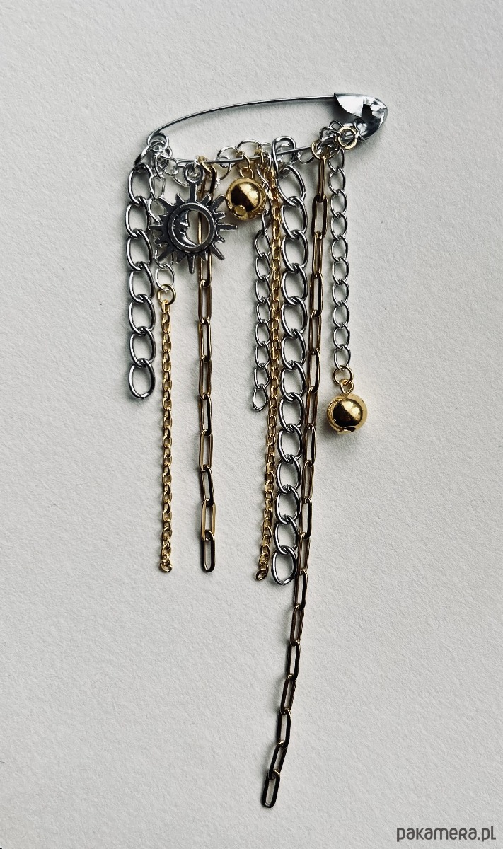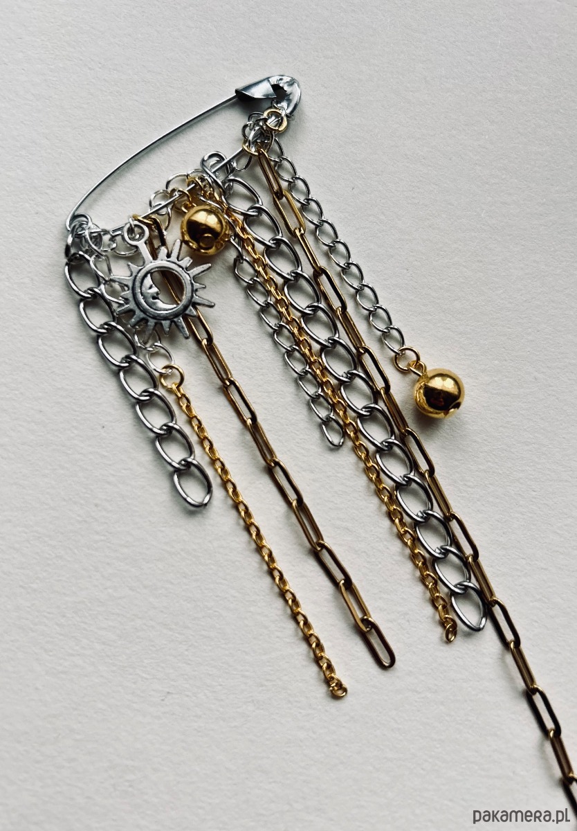 Autorska broszka z agrafką w niecodziennej kolorystyce: srebro i złoto. Połączenie nieoczywiste a jednak pasujące idealnie.