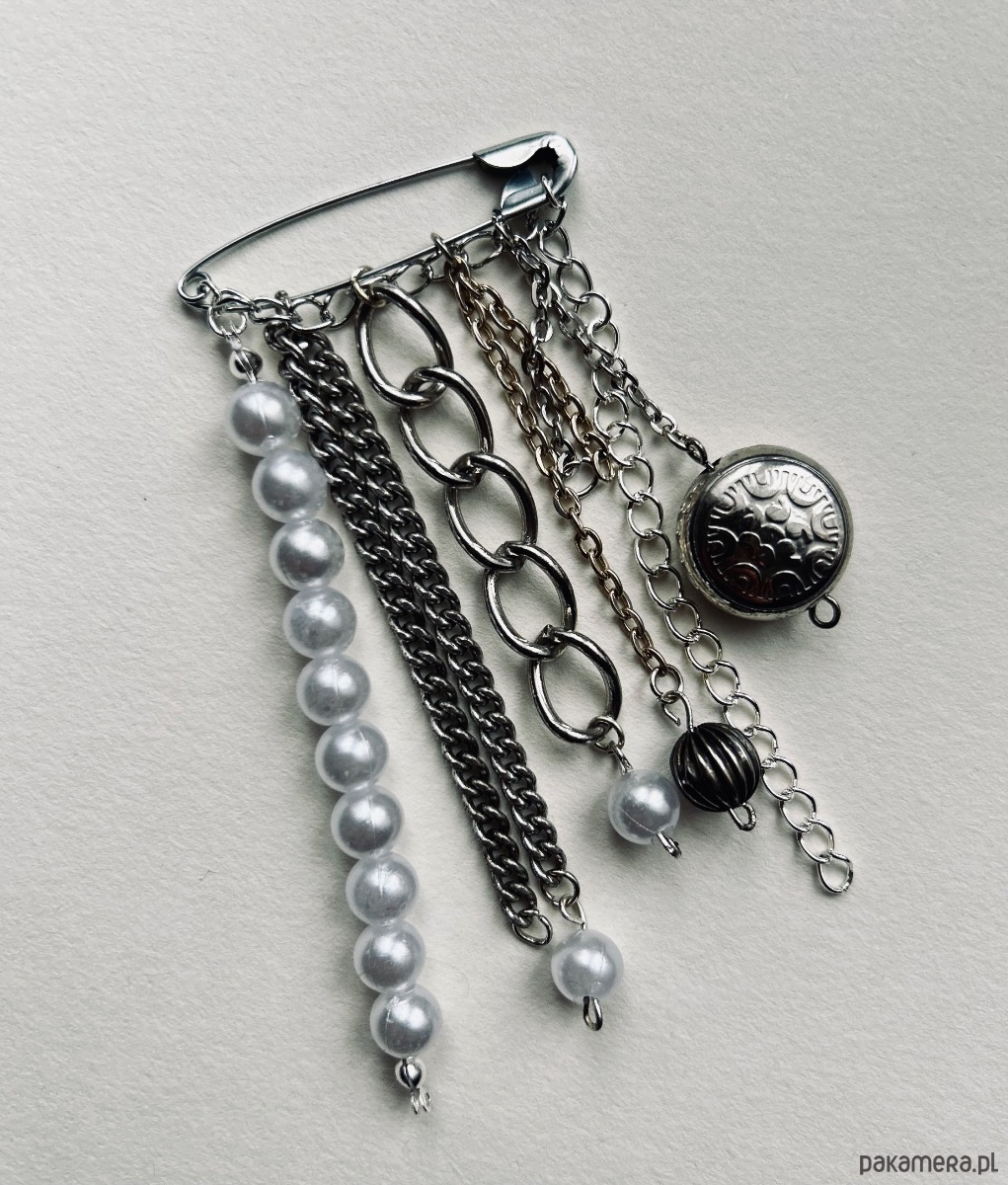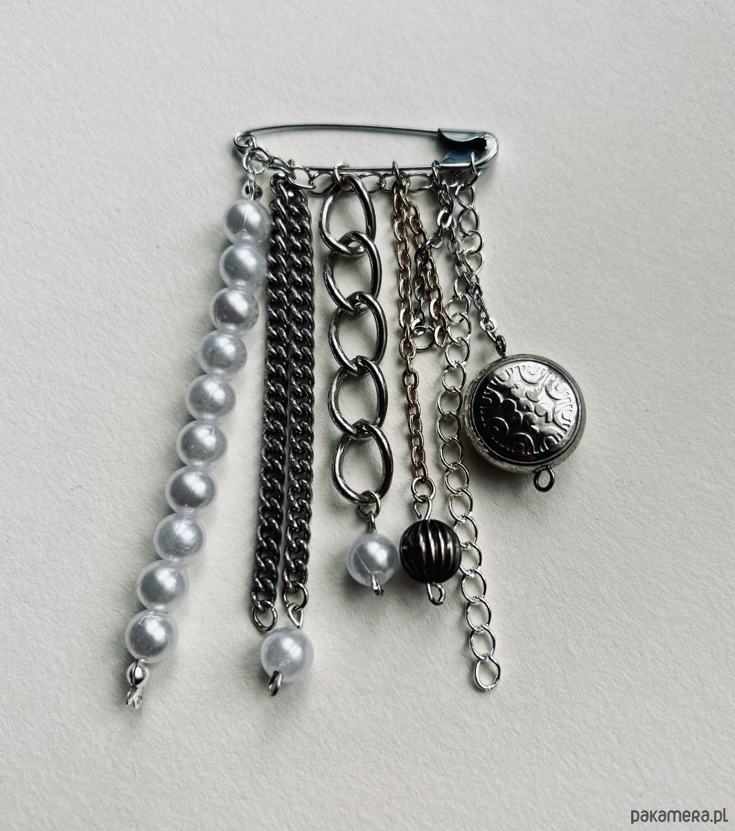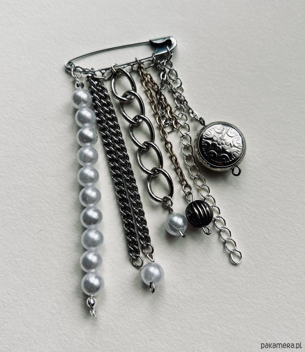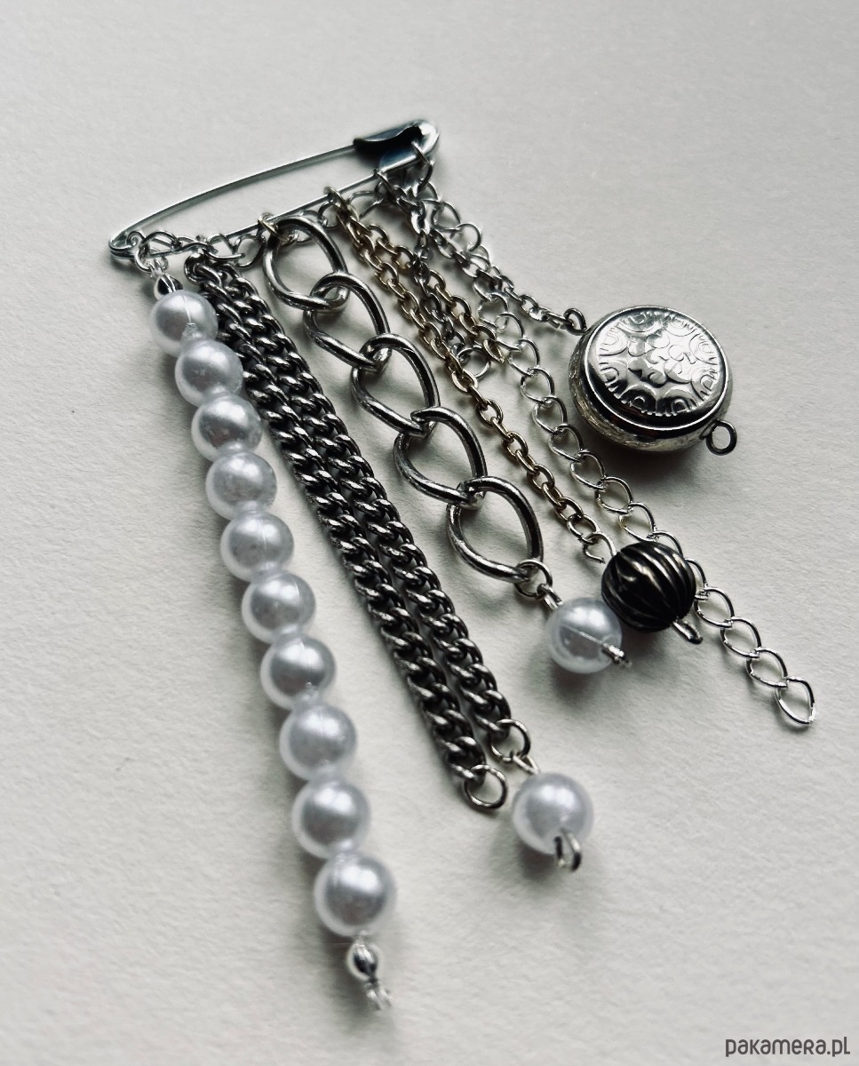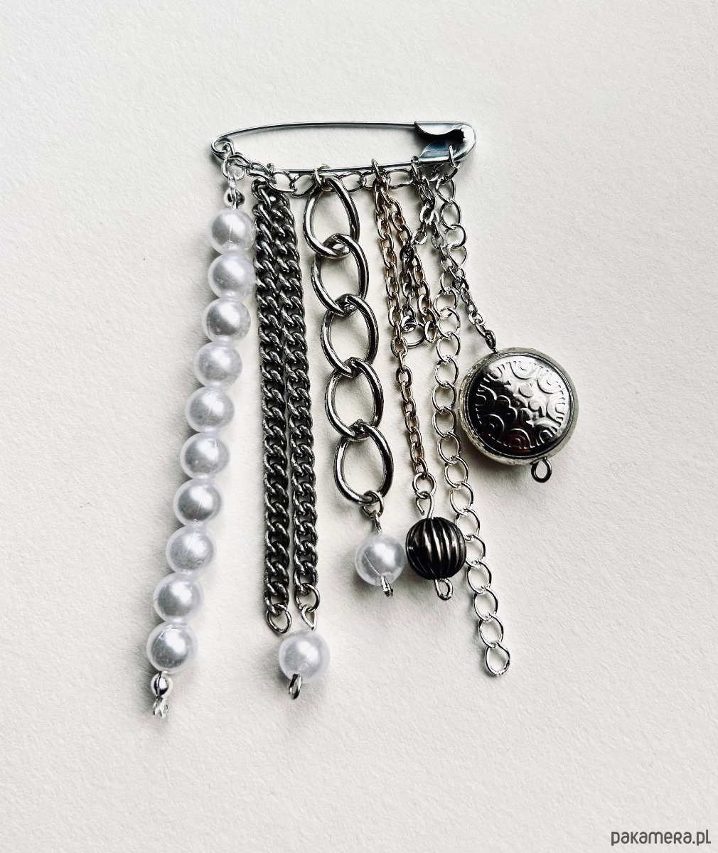 Broszka, która łączy w sobie vintage’owy styl oraz przedmioty z historią, wprowadza nowoczesne podejście do autorskiej biżuterii. Wykonana z łańcuszków o różnej grubości, perłowych i metalowych koralików, a także zawieszki przypominającej zegarek kieszonkowy, tworzy harmonijną kompozycję, która porusza się razem z Tobą.